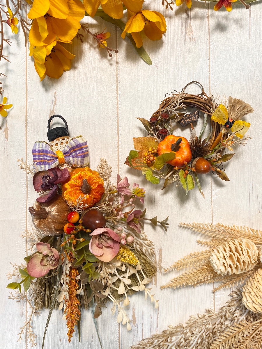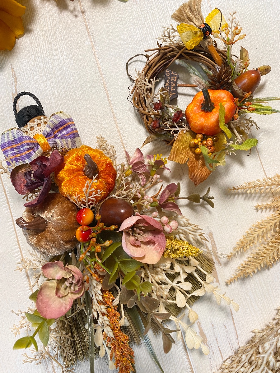 ほうきとミニリースにかぼちゃや秋色小花と木の実を飾ったナチュラルインテリアです。