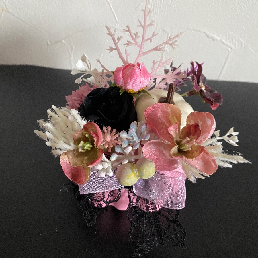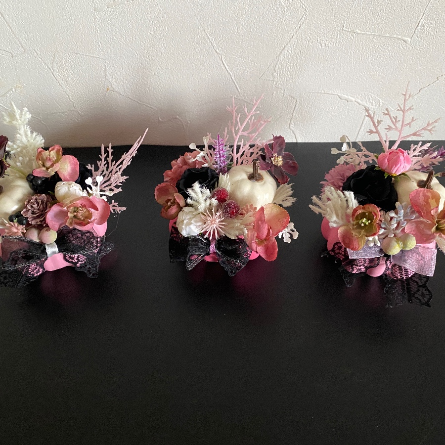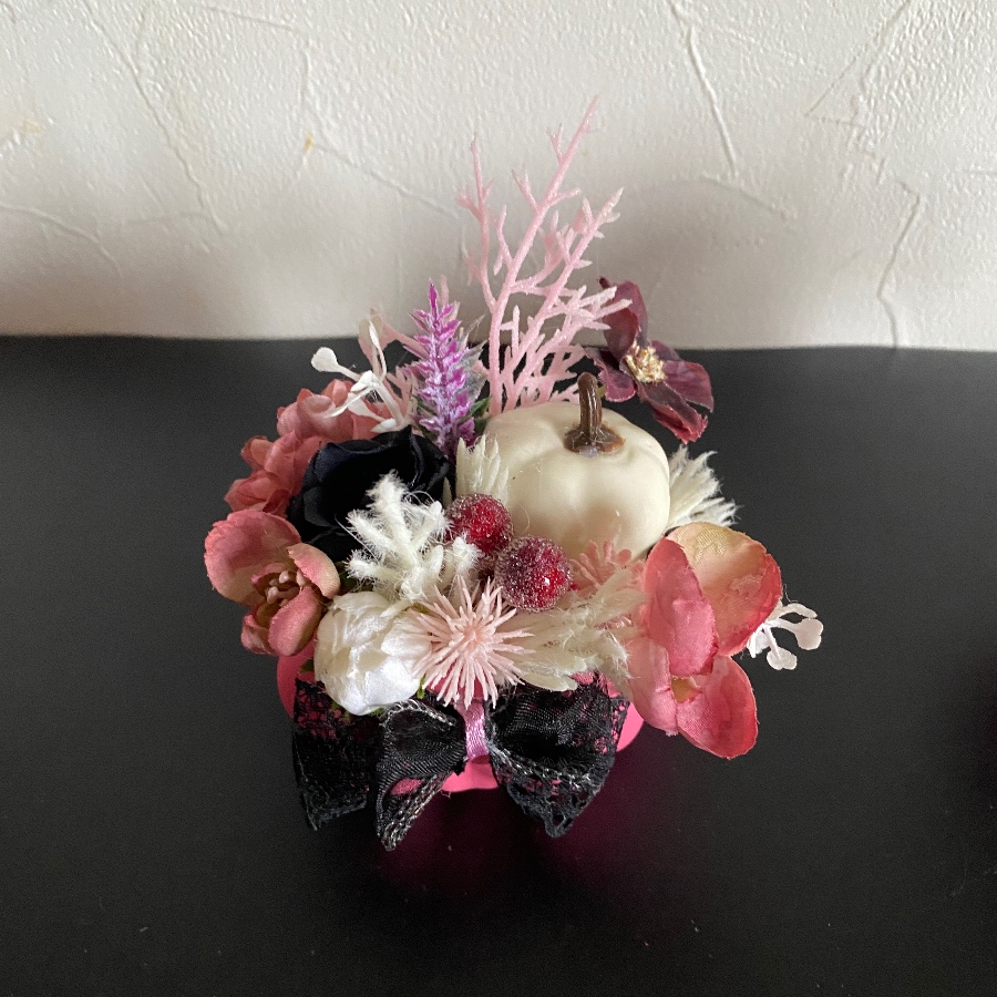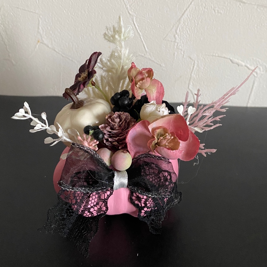 ピンクのかぼちゃに黒×ピンク×ホワイトの花材を飾りました。
