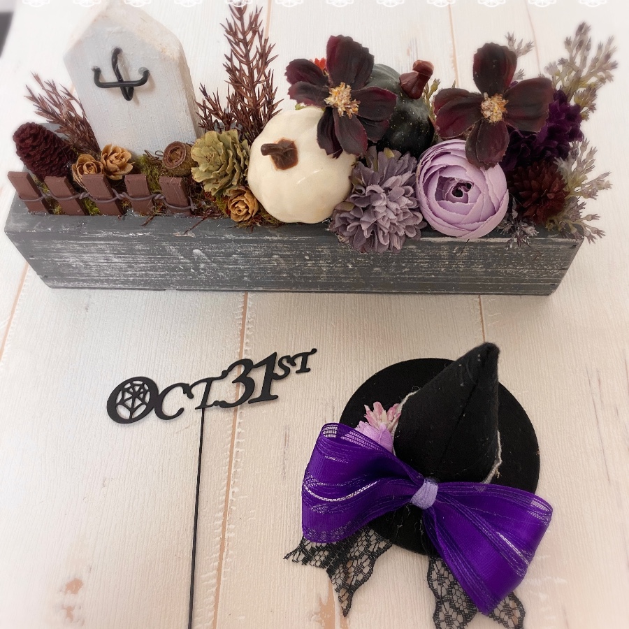 バトンを置き型に使って、魔女のお家をイメージし、パープル系のお花や木の実を飾ったハロウィンガーデンです。