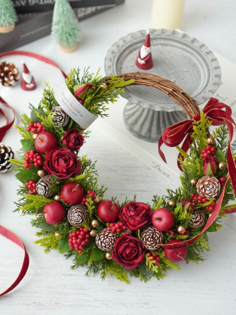 リンゴや赤バラ、松ぼっくり、実ものを贅沢にあしらった華やかなリース。