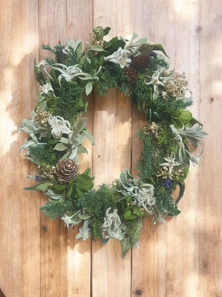 ヒムロスギの爽やかなグリーンベースに、白いお花が爽やかなエーデルワイスをあしらったリースです。