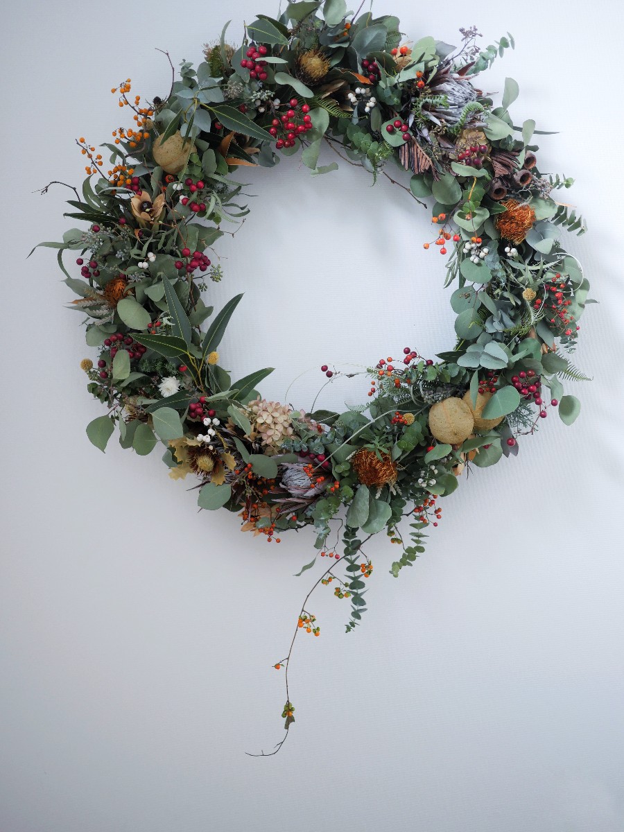 リースやブーケの中にストーリー性があり、草花が風にゆれる自然の景色をそのまま切り取ったかのような作品づくりをしています。