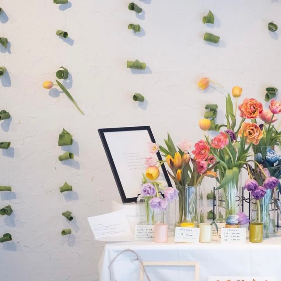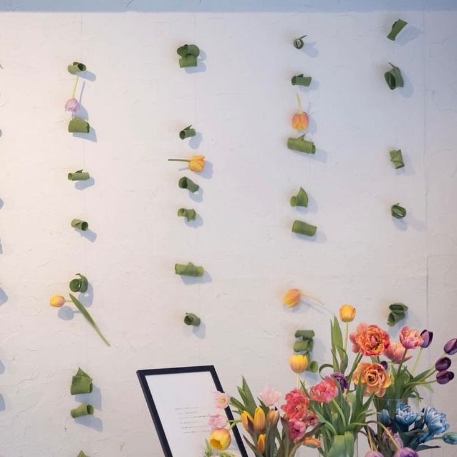 チューリップの花束を作る際に捨ててしまう葉の部分をくるんと巻き、つなげたフラワーカーテンです。