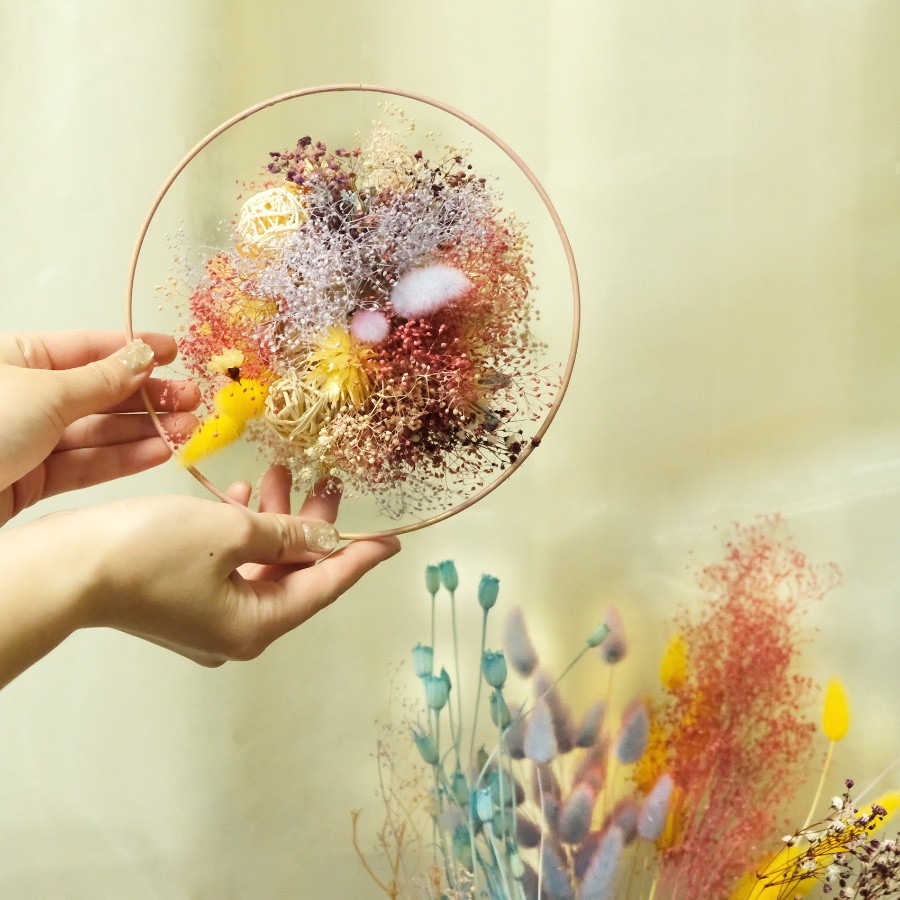みかんの”皮”の部分と私の軸であるお花やリーフを添えてリースをつくるワークショップ