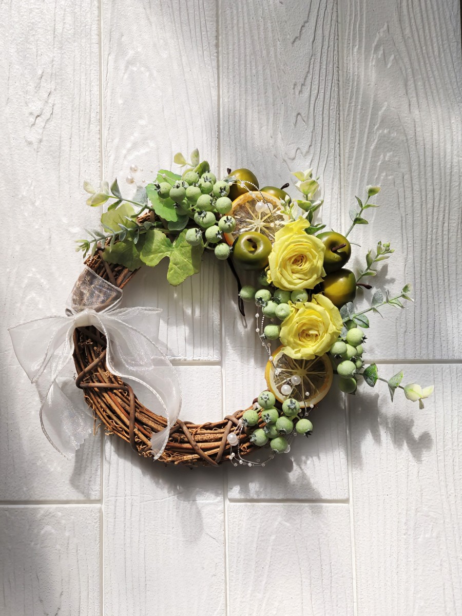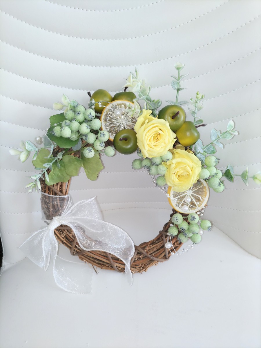 レモンとリンゴのフルーツに、ブリザーブドフラワーの黄色い薔薇をアレンジメントしたリースです。