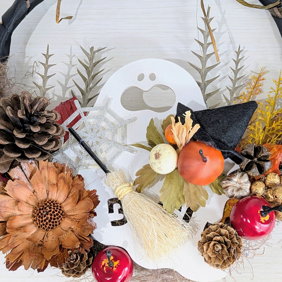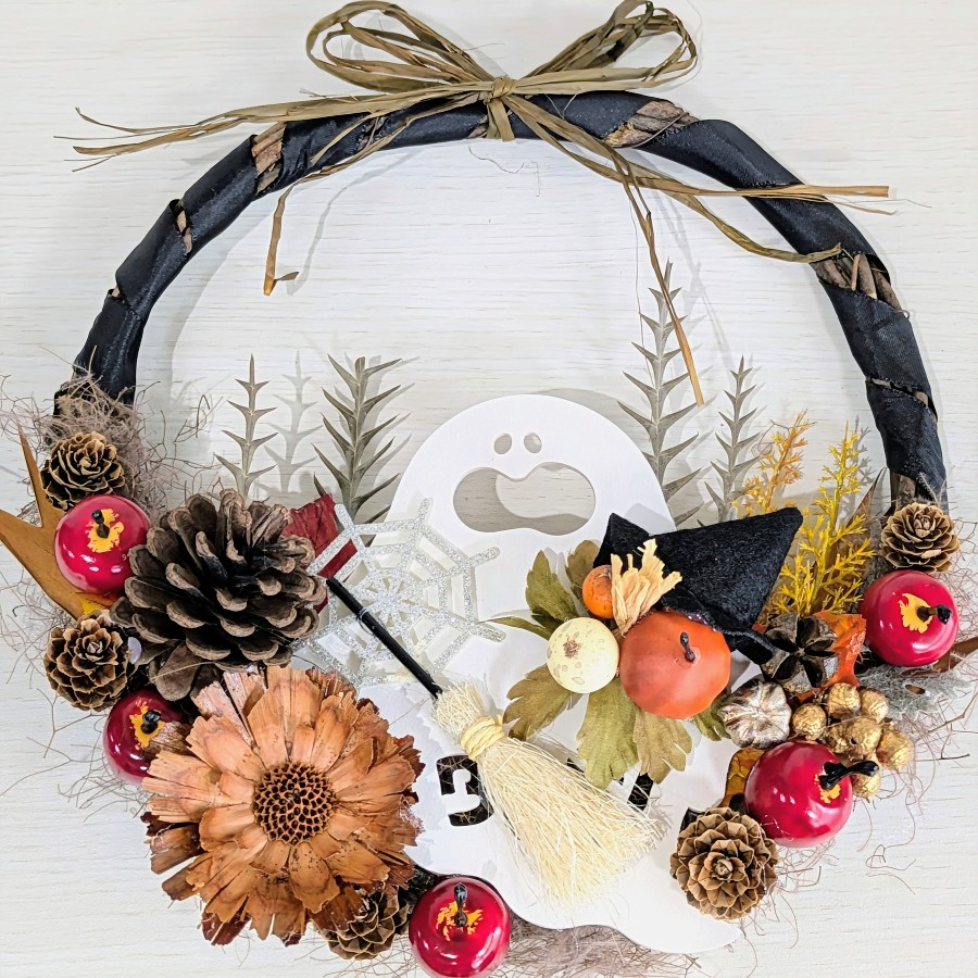 ドライフラワーや木の実を使ったハロウィン森のオバケリースです。おどろオドロしいオバケをイメージしました。