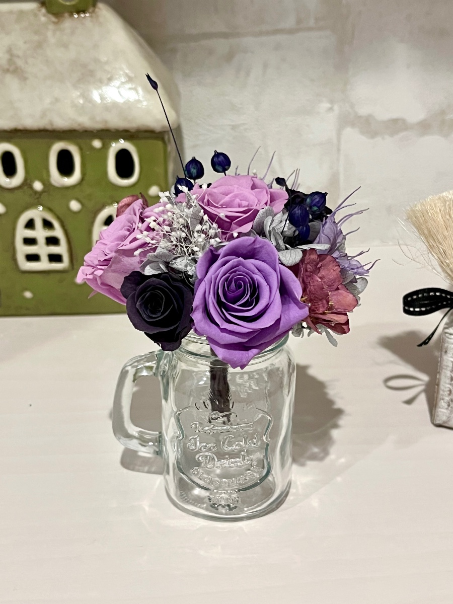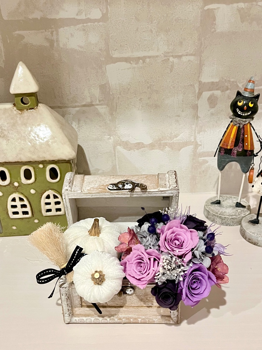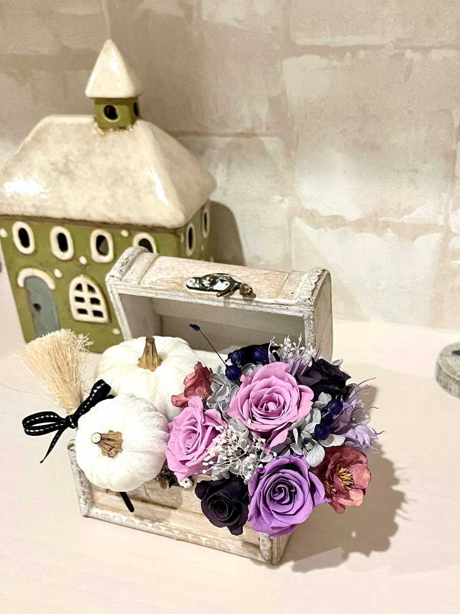 シャビーシックなトレジャーボックスにパープル×ブラックのプリザーブドフラワーを組み合わせ大人っぽい雰囲気に。
