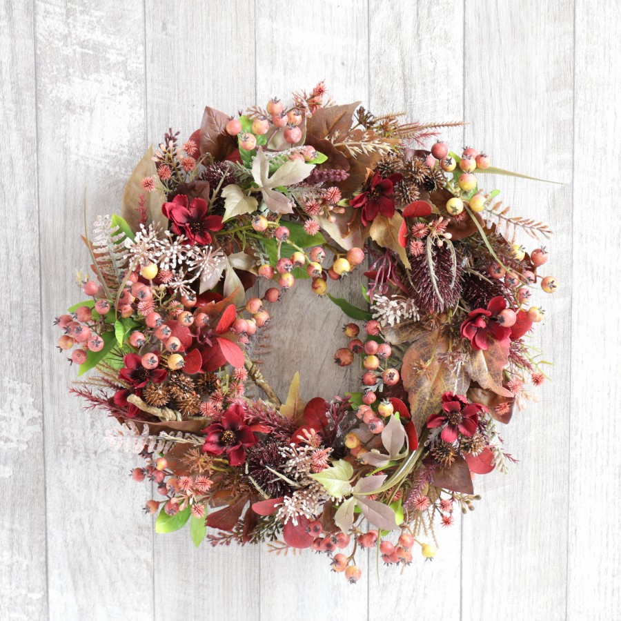 リースの主役は美しく紅葉した葉っぱと実たちです。