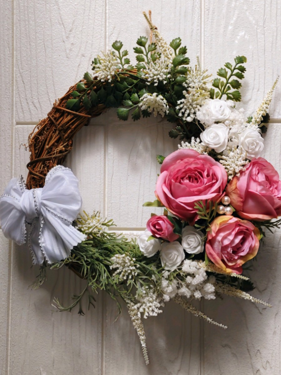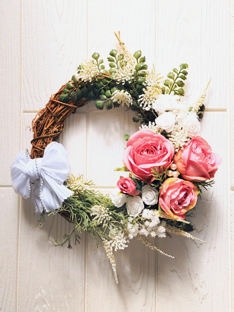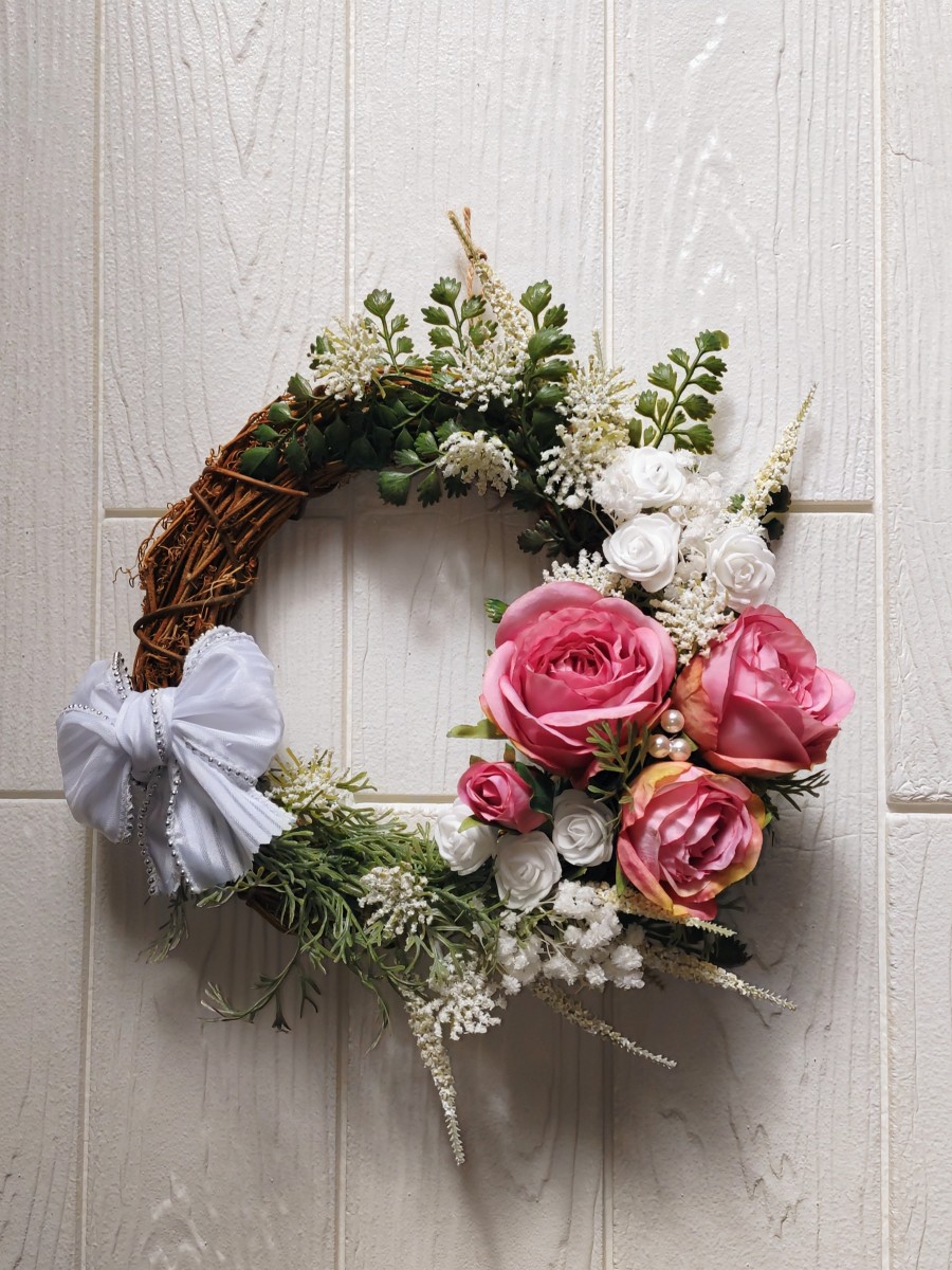 アーティフィシャルフラワーの薔薇のお花とブリザーブドフラワーのかすみ草をリースにアレンジメントしました。