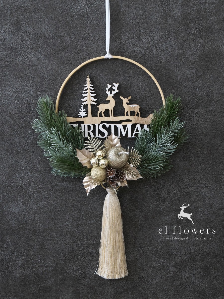木製のトナカイシルエットと長いタッセル、シャンパンゴールドのリンゴの飾りが印象的で、ナチュラルモダンなインテリアにもぴったりです。