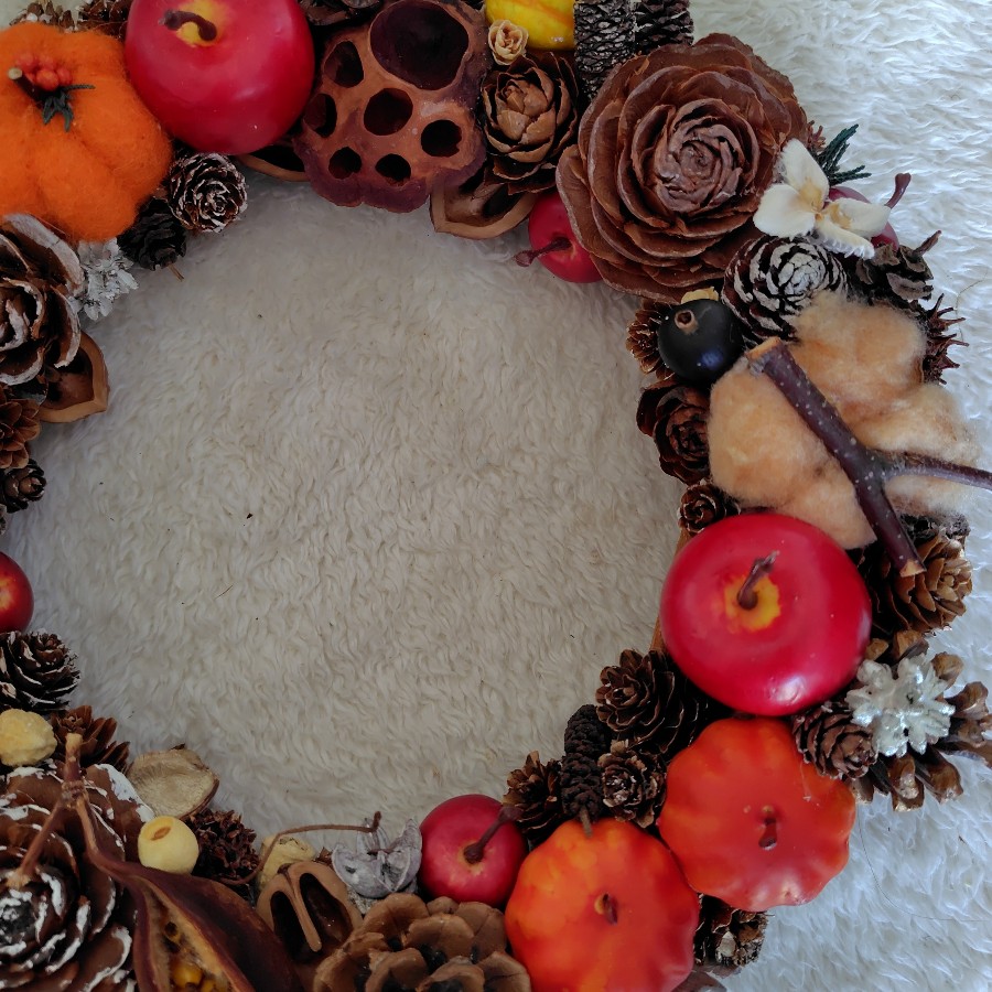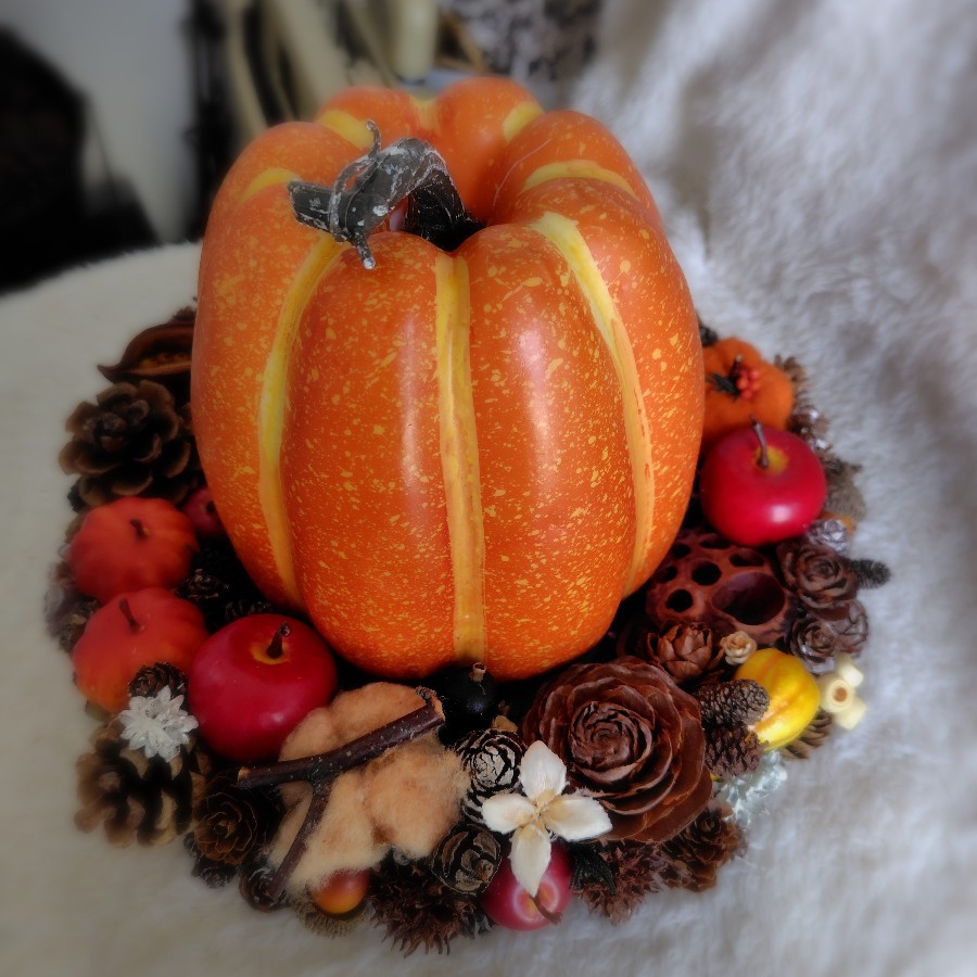秋素材たっぷりの大きめリースと、リースにすっぽりはまるフェイクかぼちゃと…