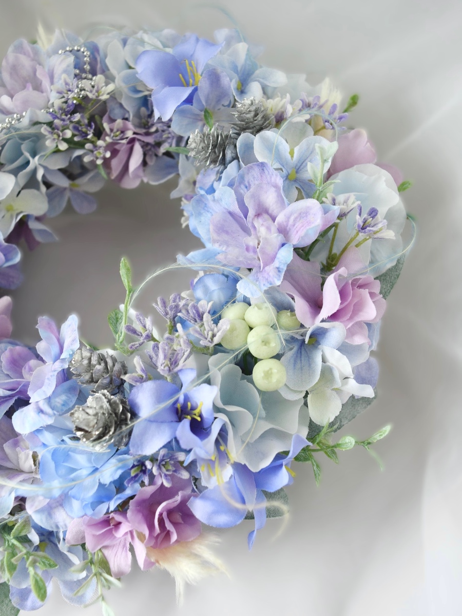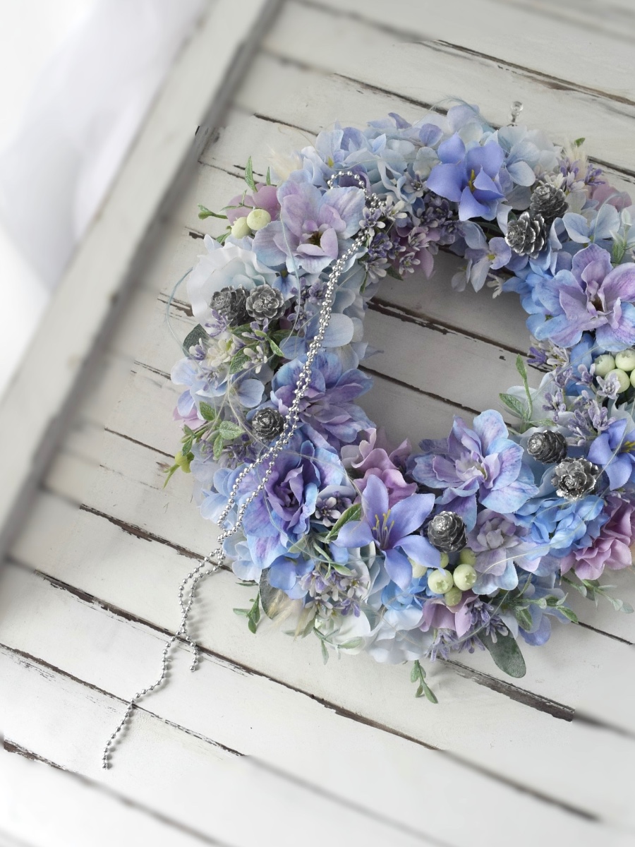 ブルーとラベンダーのグラデーションでまとめたワイヤリングリースです。