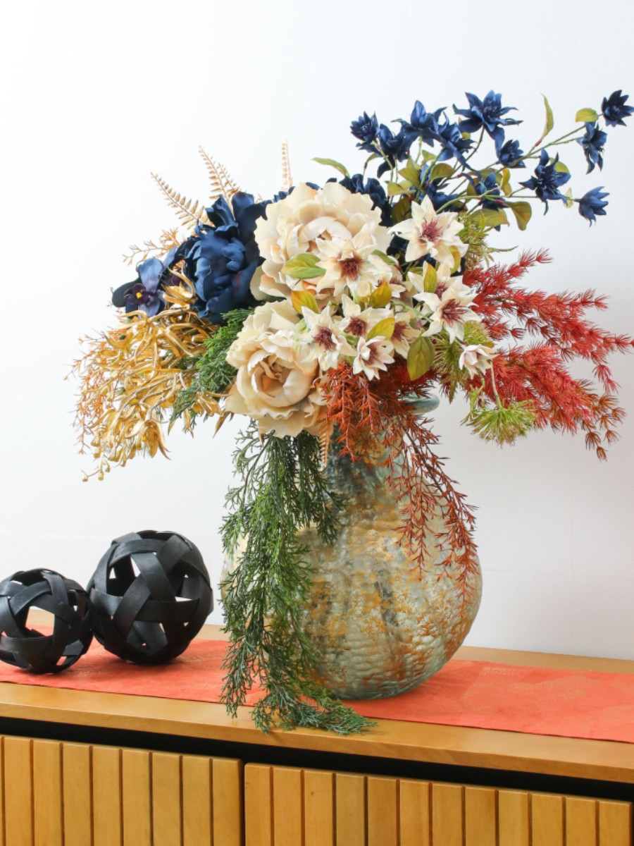 オフホワイトとネイビーのフラワーに秋色リーフとゴールド素材を組み合わせたアレンジメントは小物を変えることでクリスマスシーズンから迎春まで楽しむことができます。