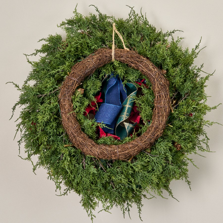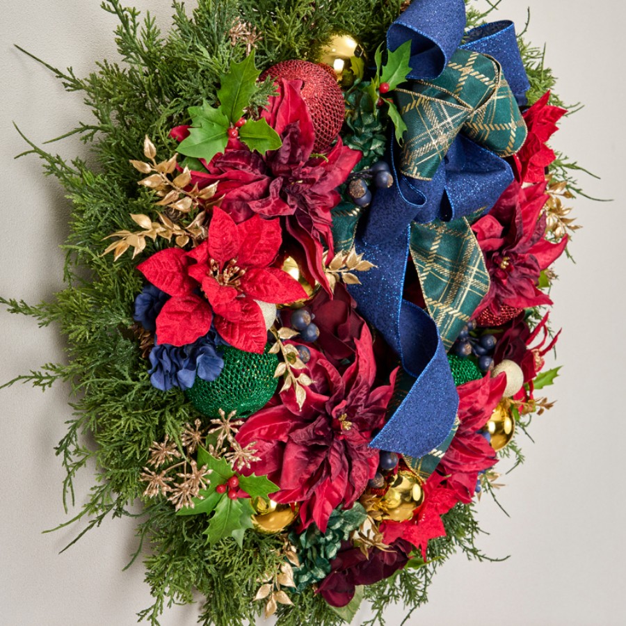 ブルーをポイントにゴールドの葉や小物がアクセントになったリースです。