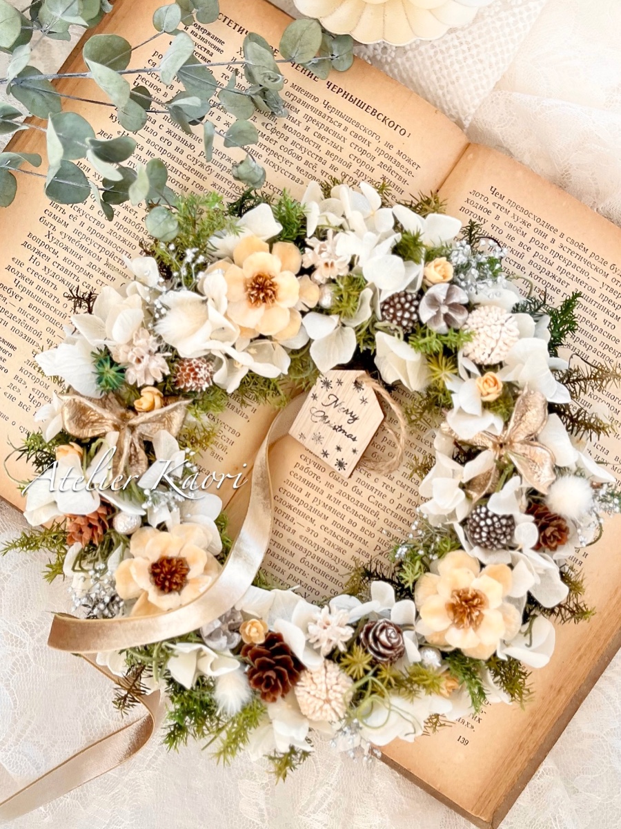 粉雪がかかったような木の実やキラキラの小花、アネモネのソラフラワーなどをのせ、ナチュラルで温かい雰囲気に仕上げました。
