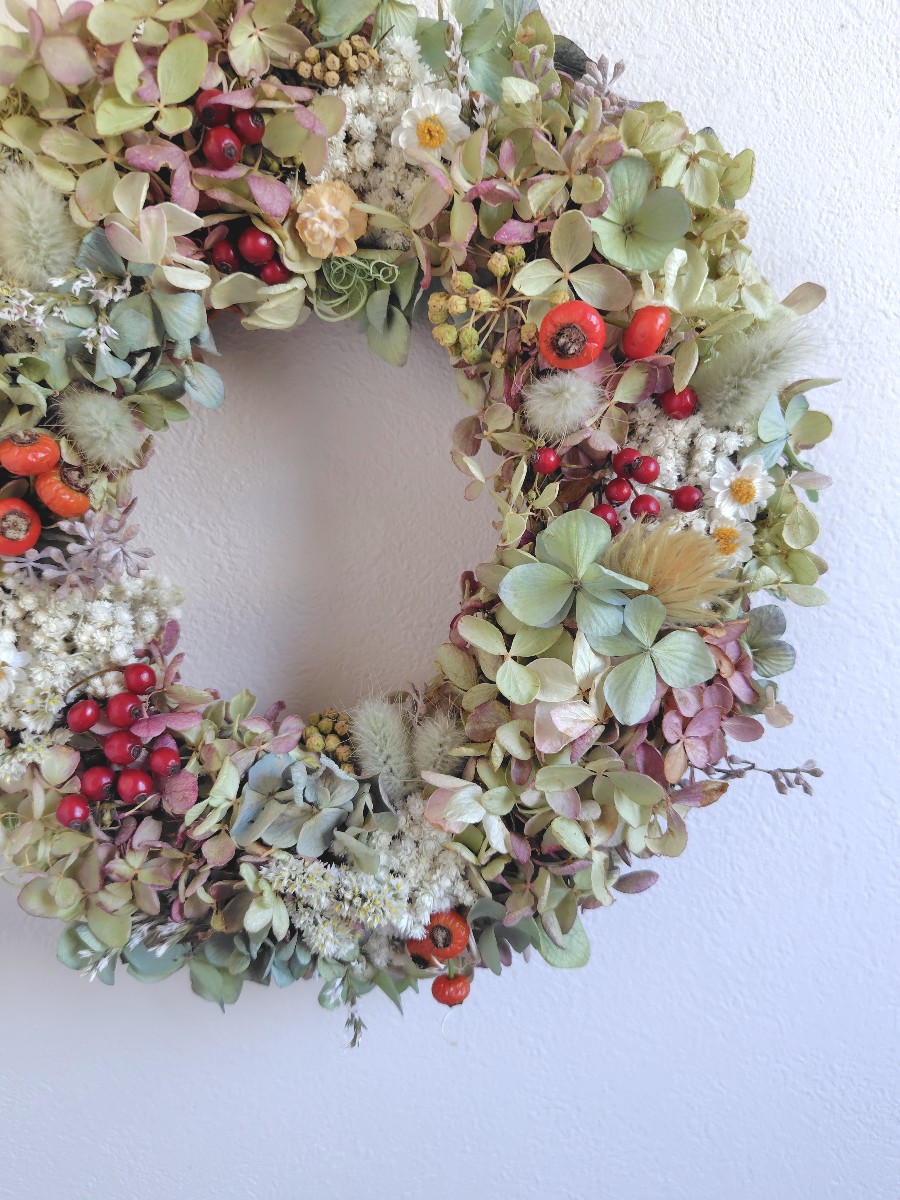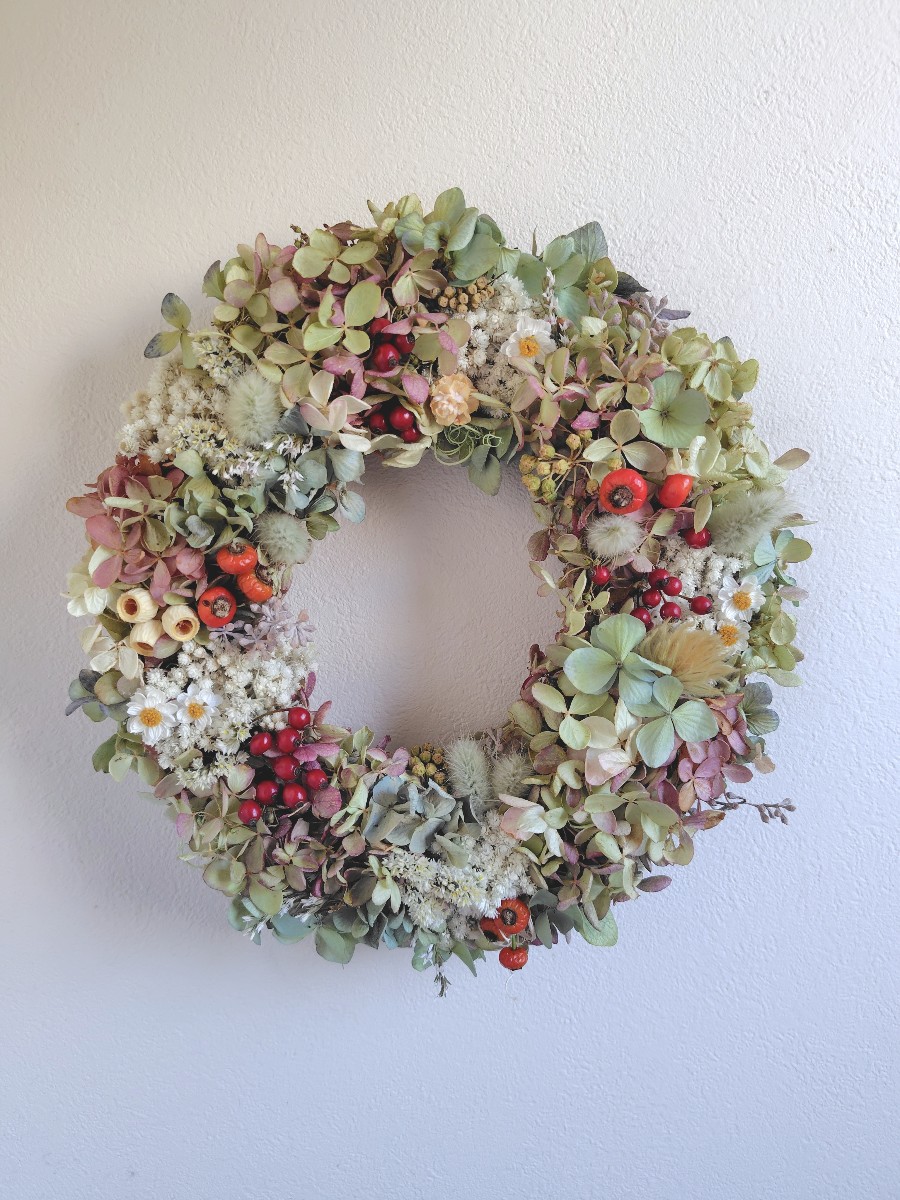 紫陽花と木の実と…、秋に色づく美しいものたちを束ねたリースです!