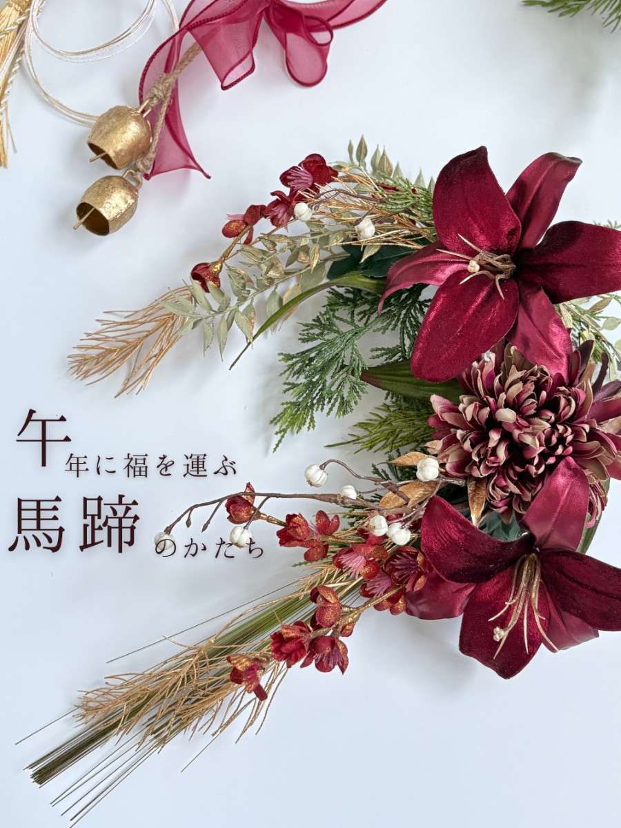 来年の干支〈午〉にちなんだ幸運の馬蹄型のリースです。