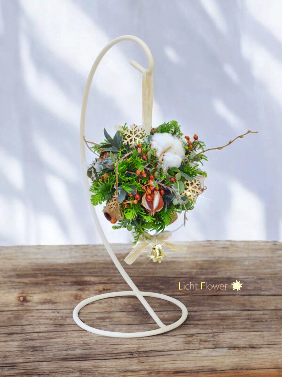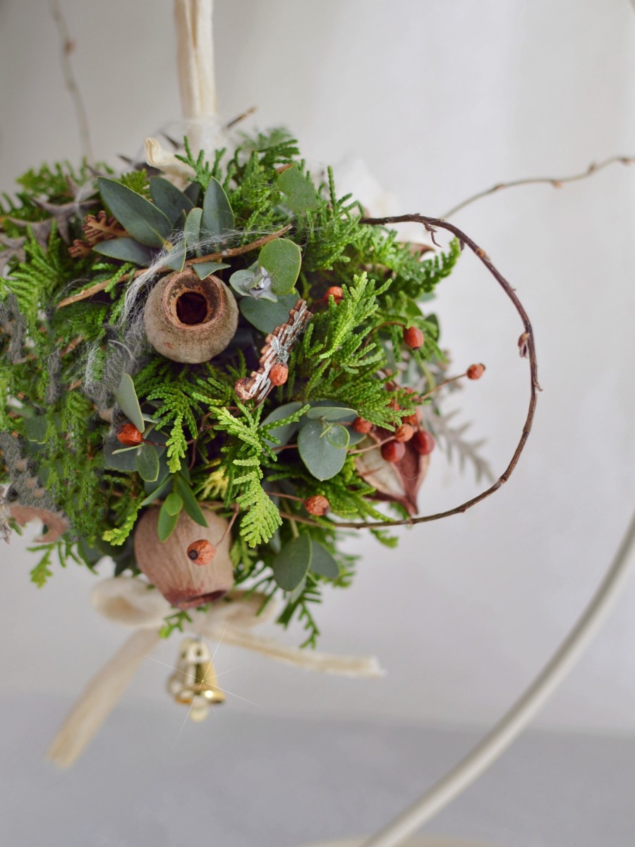 木の実やコットンとヒバ・スギの針葉樹でまとめ、ベルを下部に垂らしています。