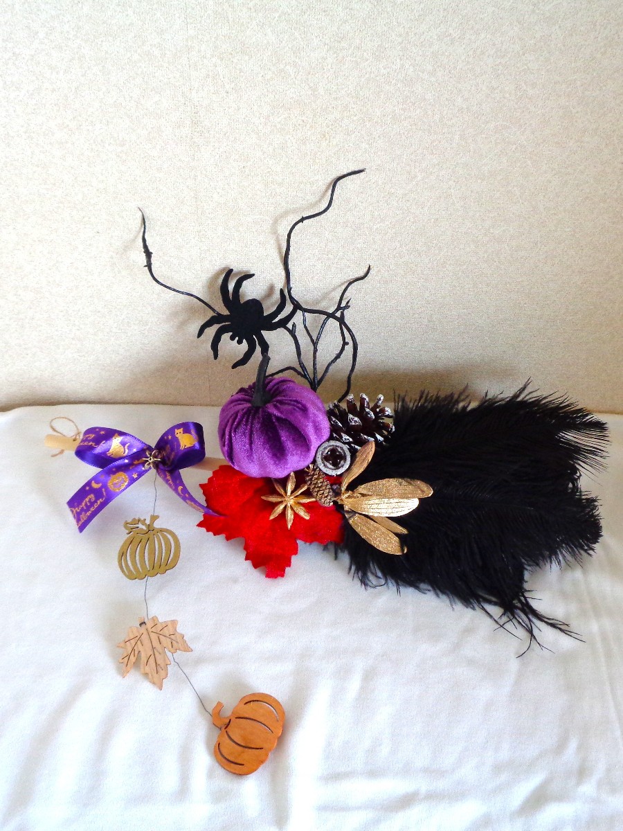 ハロウィンが近いので、ブラックフェザーホウキと自宅にあった花材を使ってアレンジメントを作ってみました。