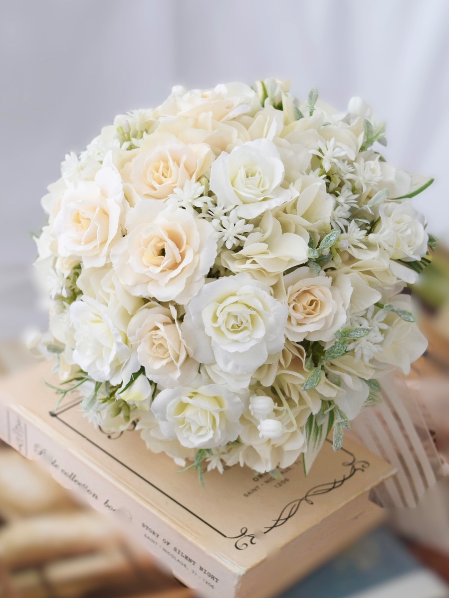 バニラ色やアイボリーの小さなバラを可愛らしくまとめました。