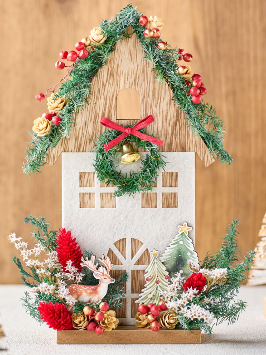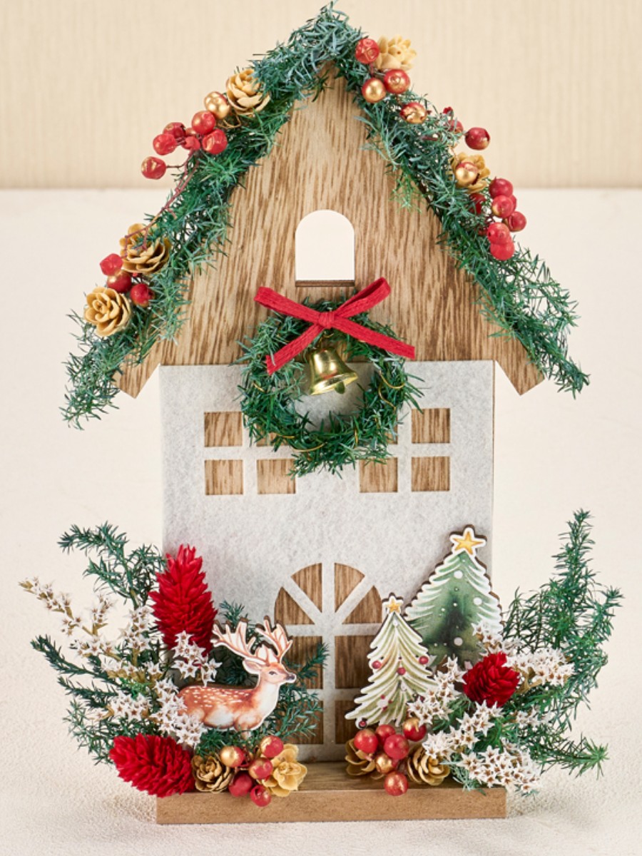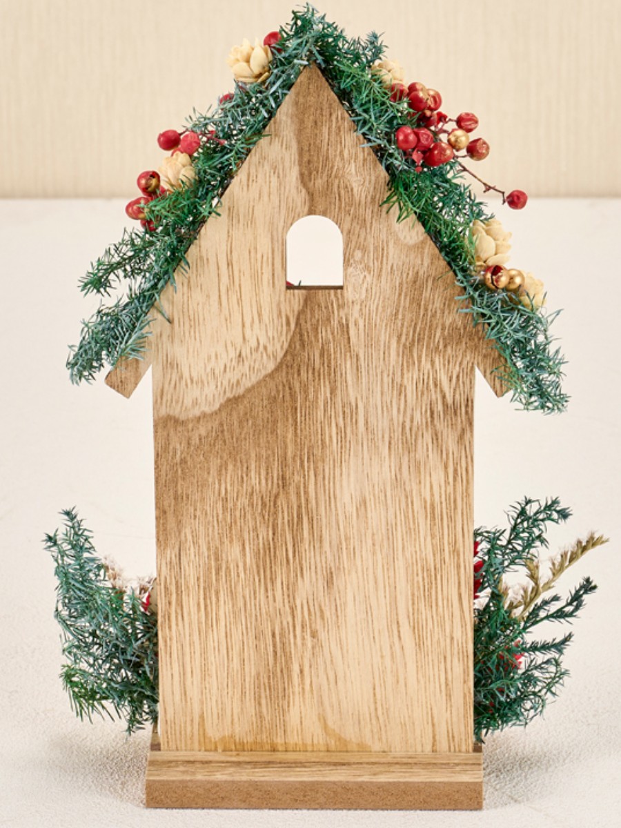 ハウスの扉の両サイドにフォームをセットし花材やオーナメントを挿します。