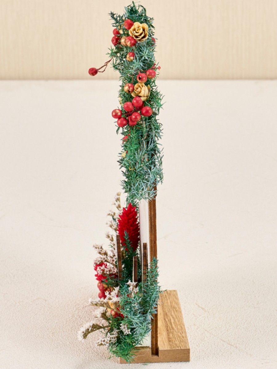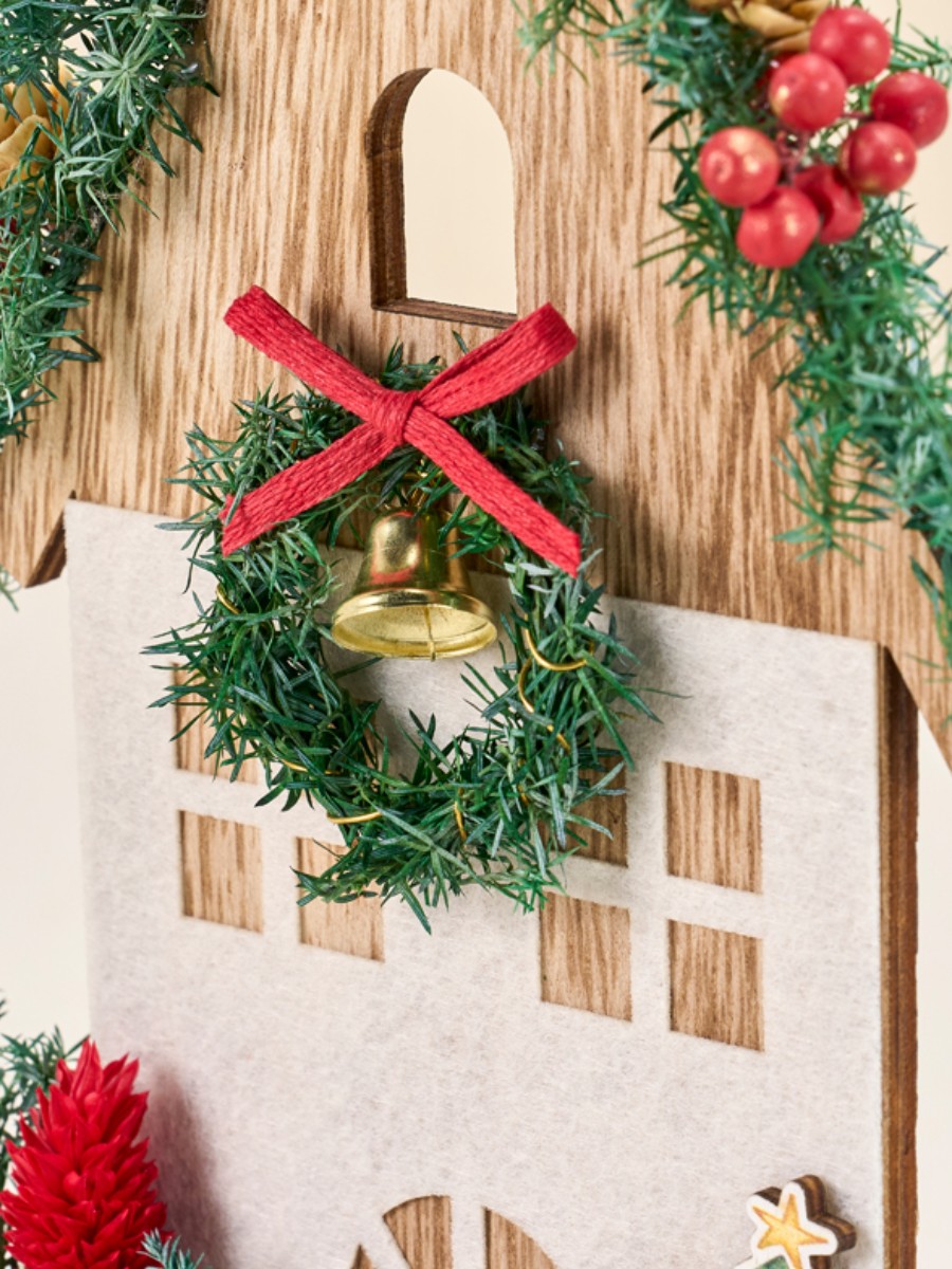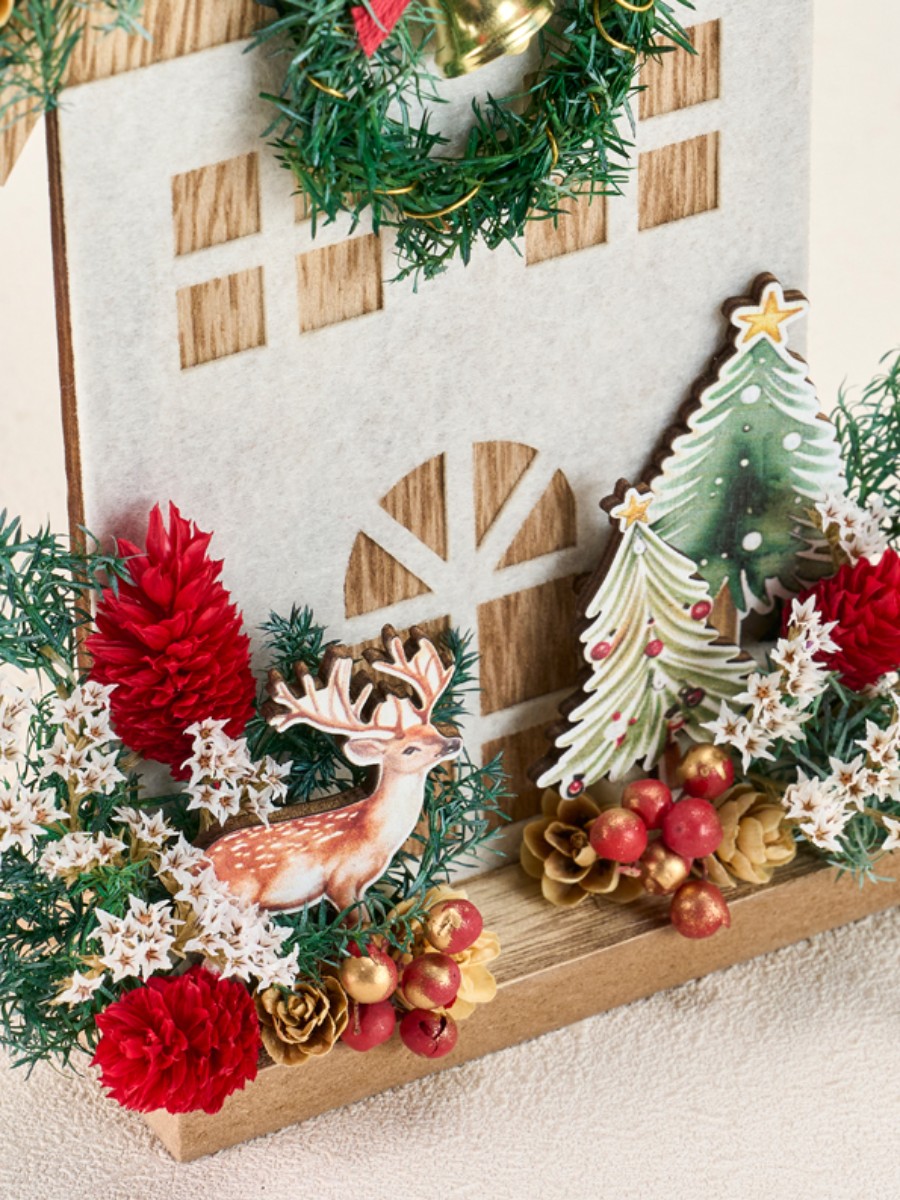 ハウスの扉の両サイドにフォームをセットし花材やオーナメントを挿します。