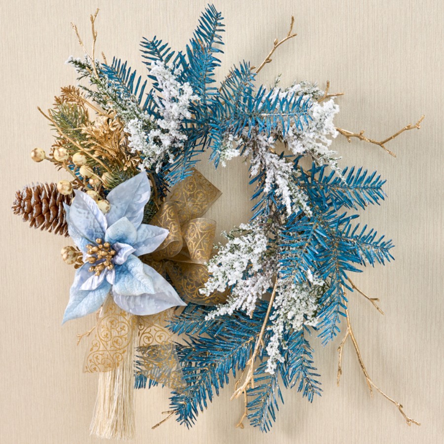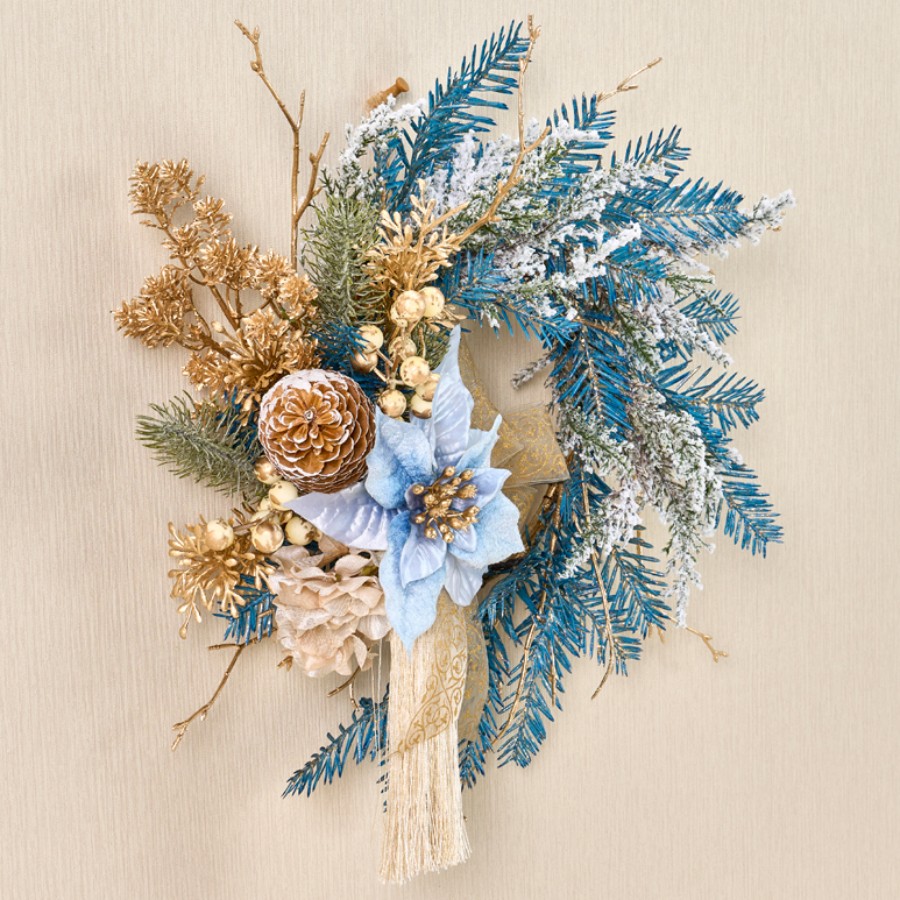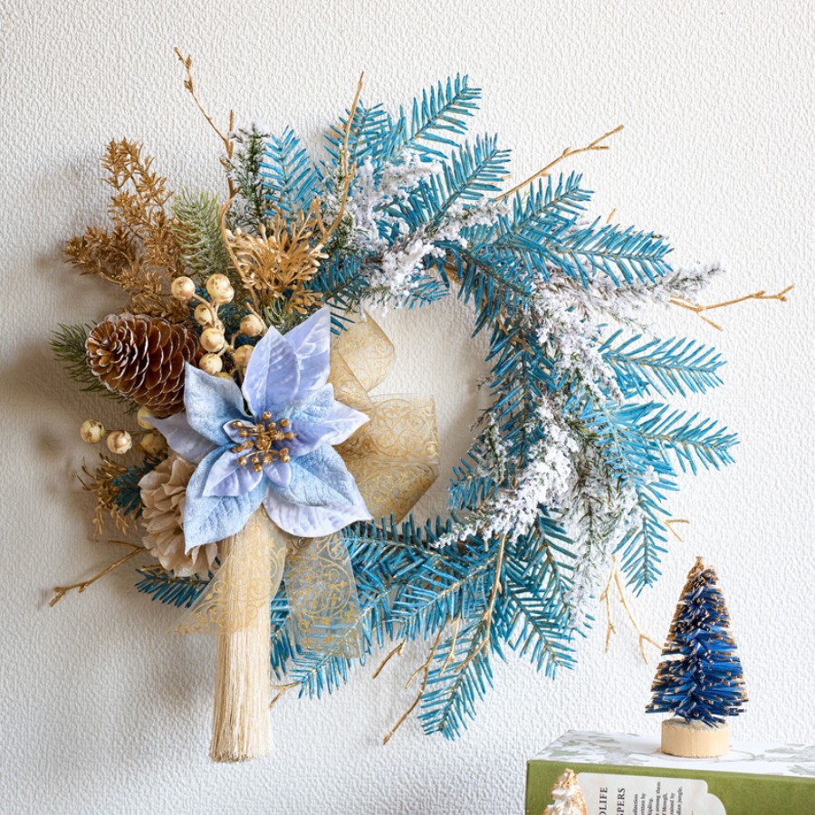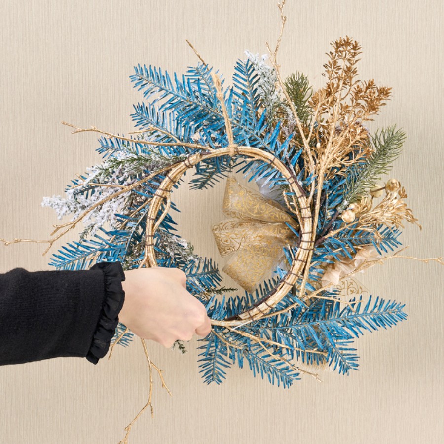 ツイッグを丸めてリースベースにし、花材やリボンはワイヤーで固定しています。リーフの青色が映えるように花材の色味を合わせました。