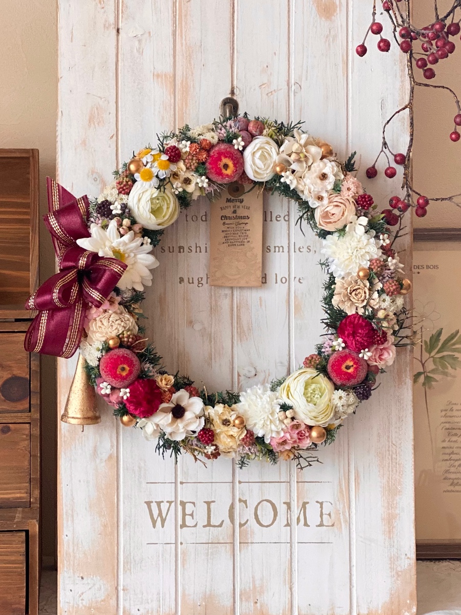 わりと大きめな土台(直径約30㎝)のクリスマスリースです。