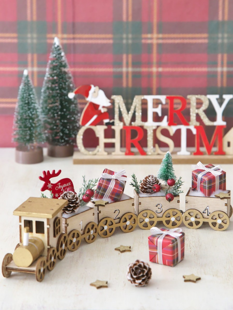 木製のトレインに、プレゼントや小さなツリーを乗せた可愛らしいクリスマスデコレーションです。