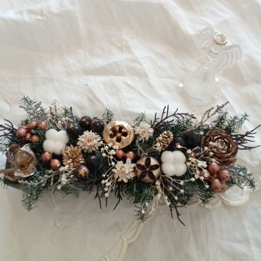 ウッドボックスに、プリザーブドフラワーのスギ、クリスマスアイテム等をアレンジしました。