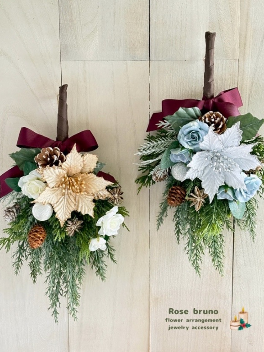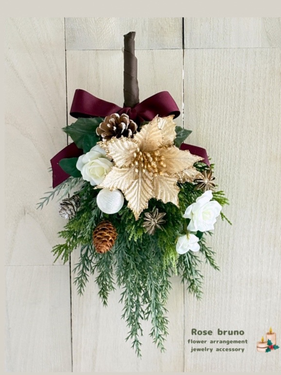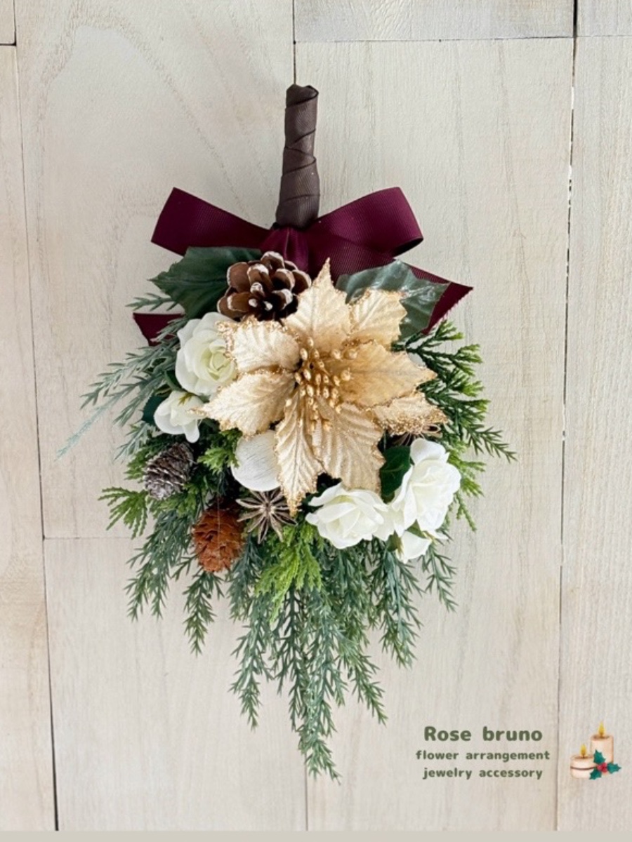 ホワイトのバラや木の実を合わせて、落ち着いた雰囲気のリボンでまとめ大人っぽいミニスワッグに仕上げました♡