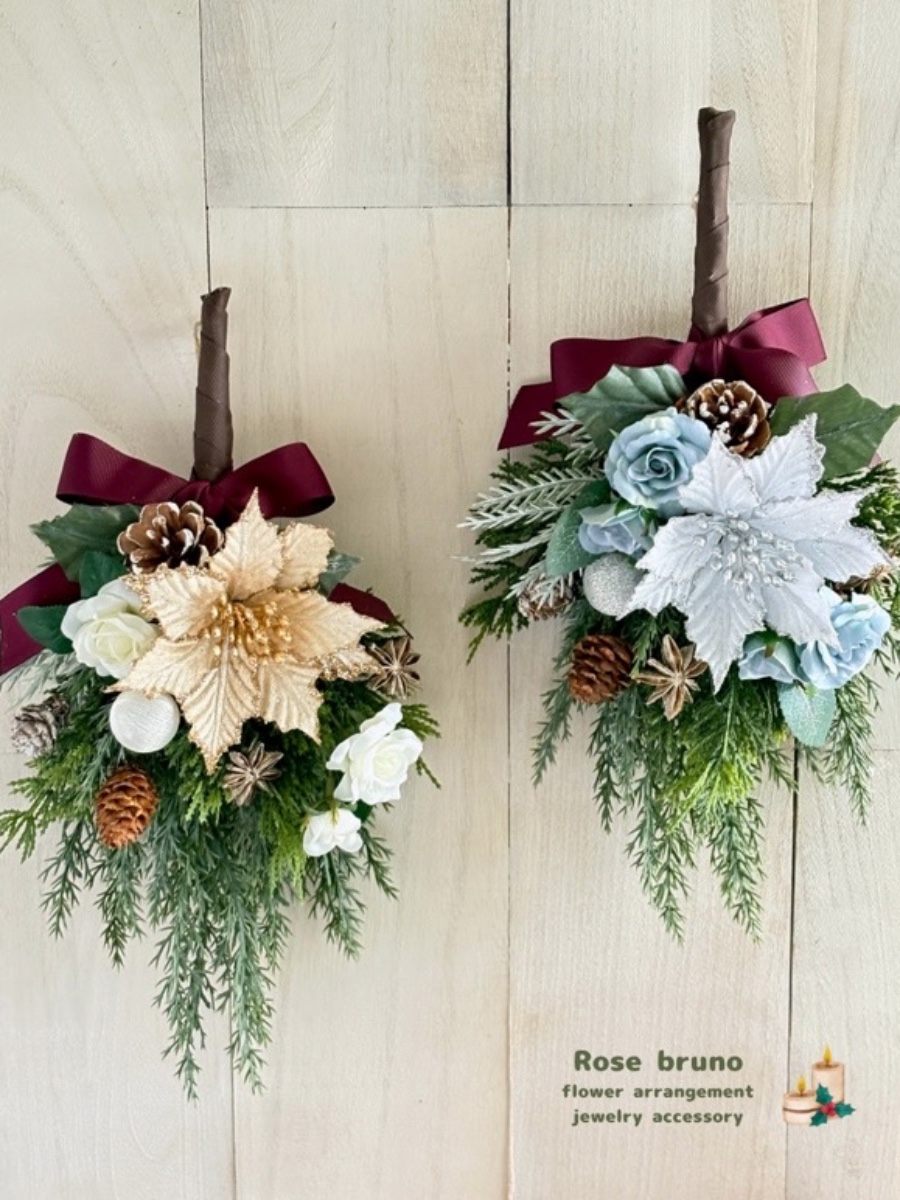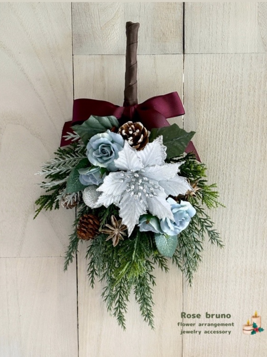 輝くシルバーホワイトのポインセチアを主役にシックでおしゃれなクリスマスのミニスワッグをお作りしました♡