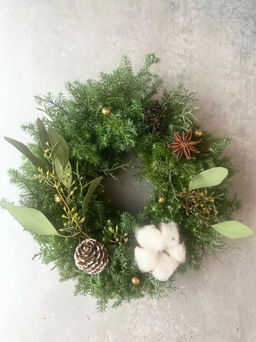 ナチュラルで大人っぽいリースで、クリスマスが終わっても冬の間飾れます。