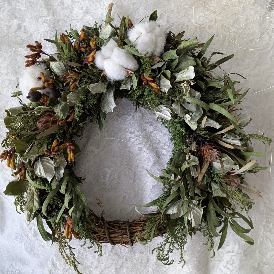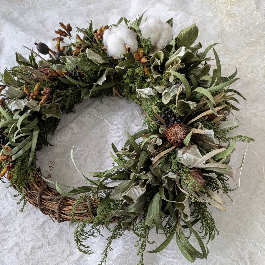ハロウィンもクリスマスもOK。秋から冬までずっと飾れるグリーンのリースです。森を感じさせるようなナチュラルな雰囲気に癒されます。