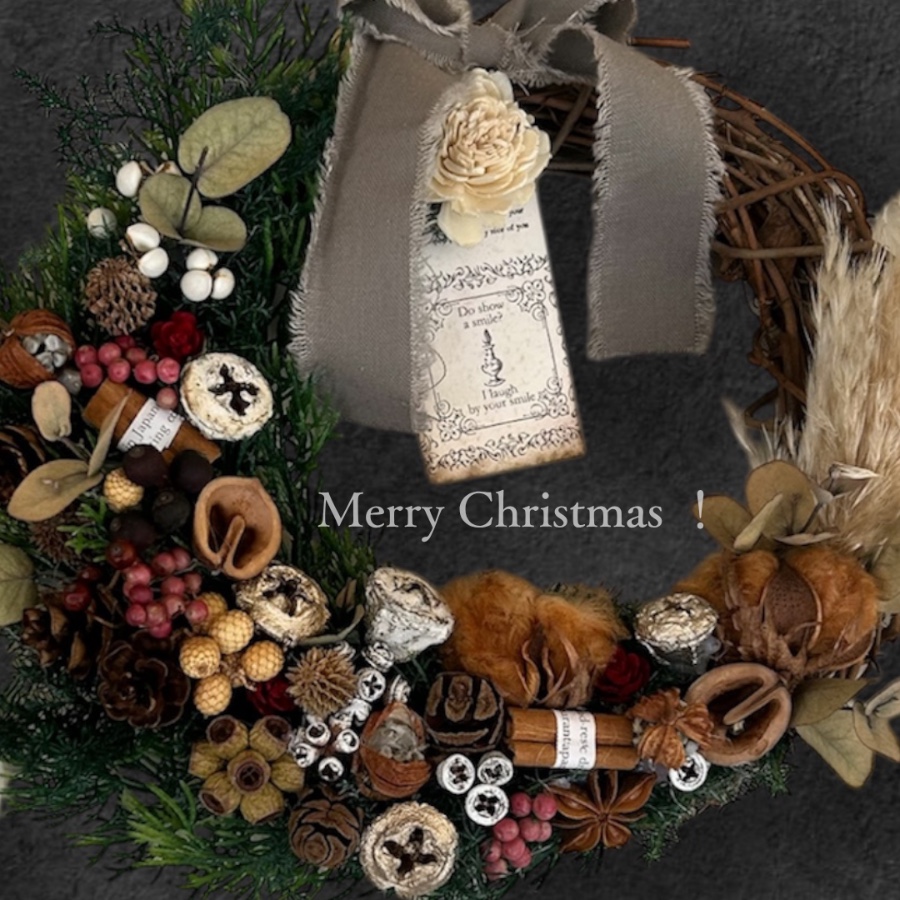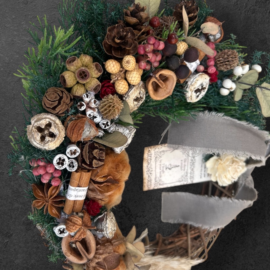 ラタンのリース土台にプリザーブドのヒムロスギやドライこ木の実をたっぷりと⭐︎