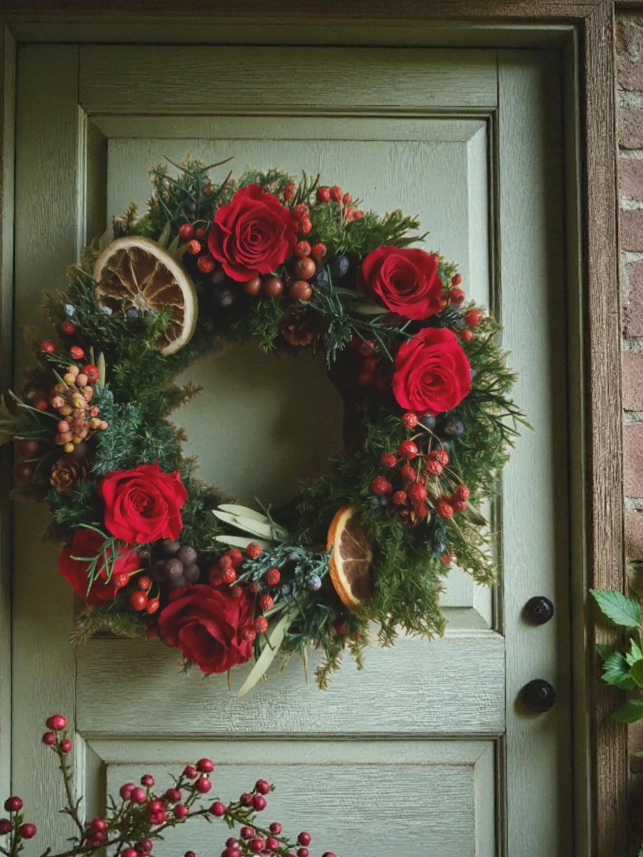 プリザーブドグリーンをたっぷりと使用したベースに赤いバラをあしらったオーソドックスなクリスマスリースです。
