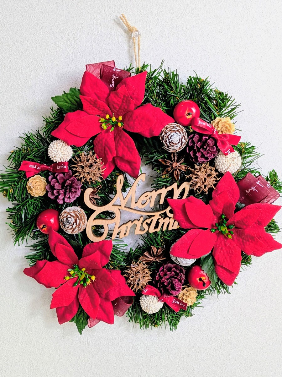 沢山の木の実やリンゴを使った遊び心あるリースです。