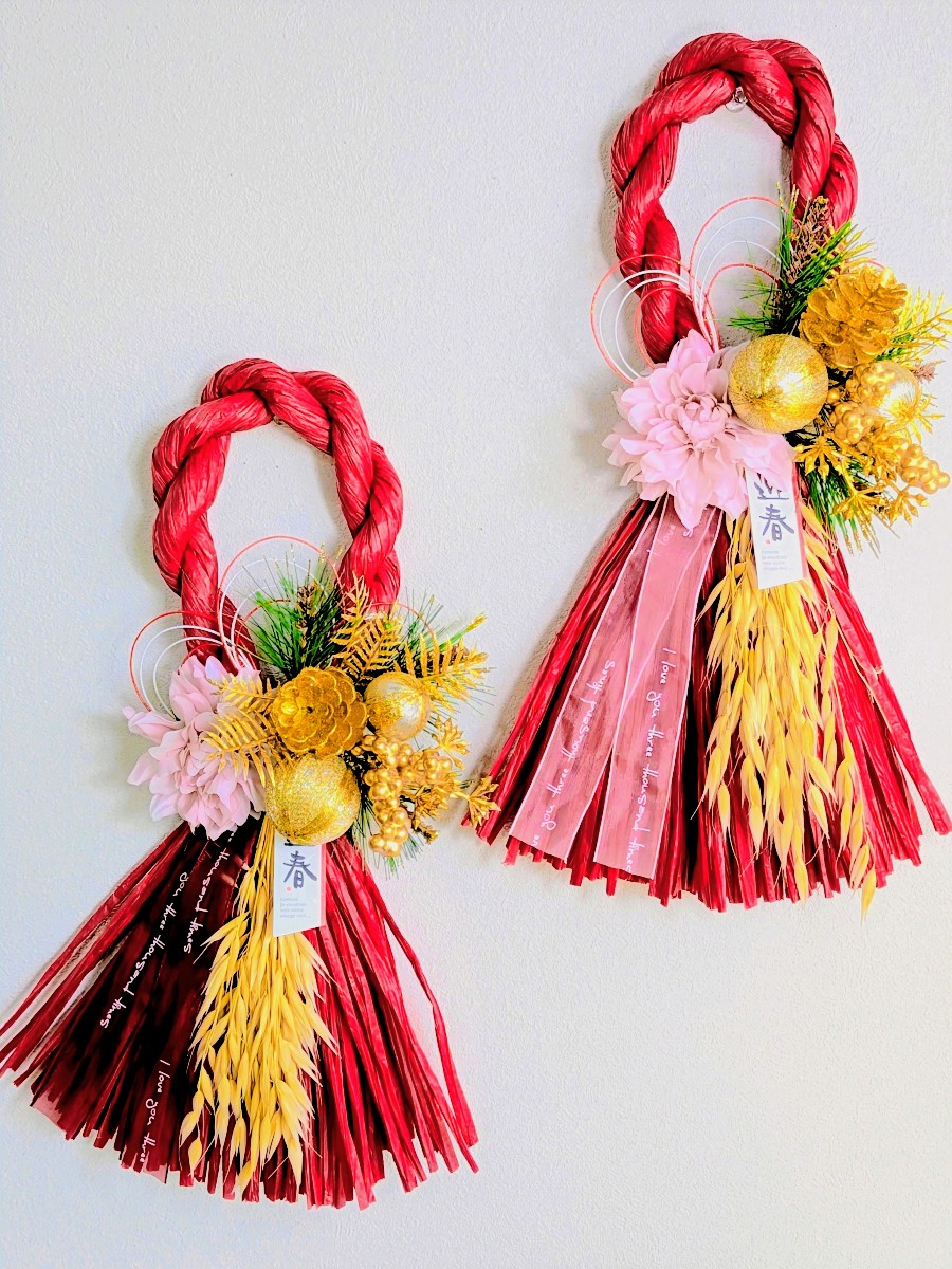 赤とゴールドのお正月飾りしめ縄飾りです。
