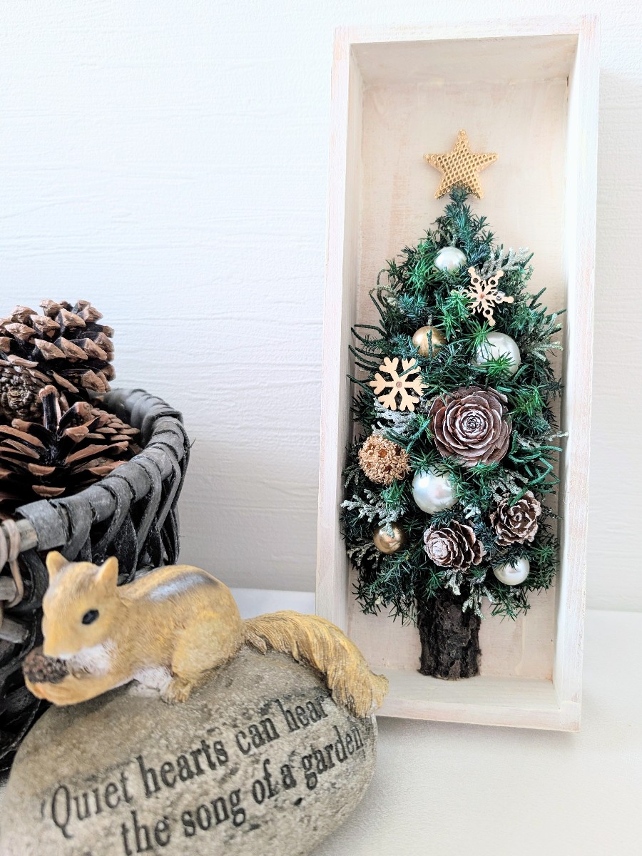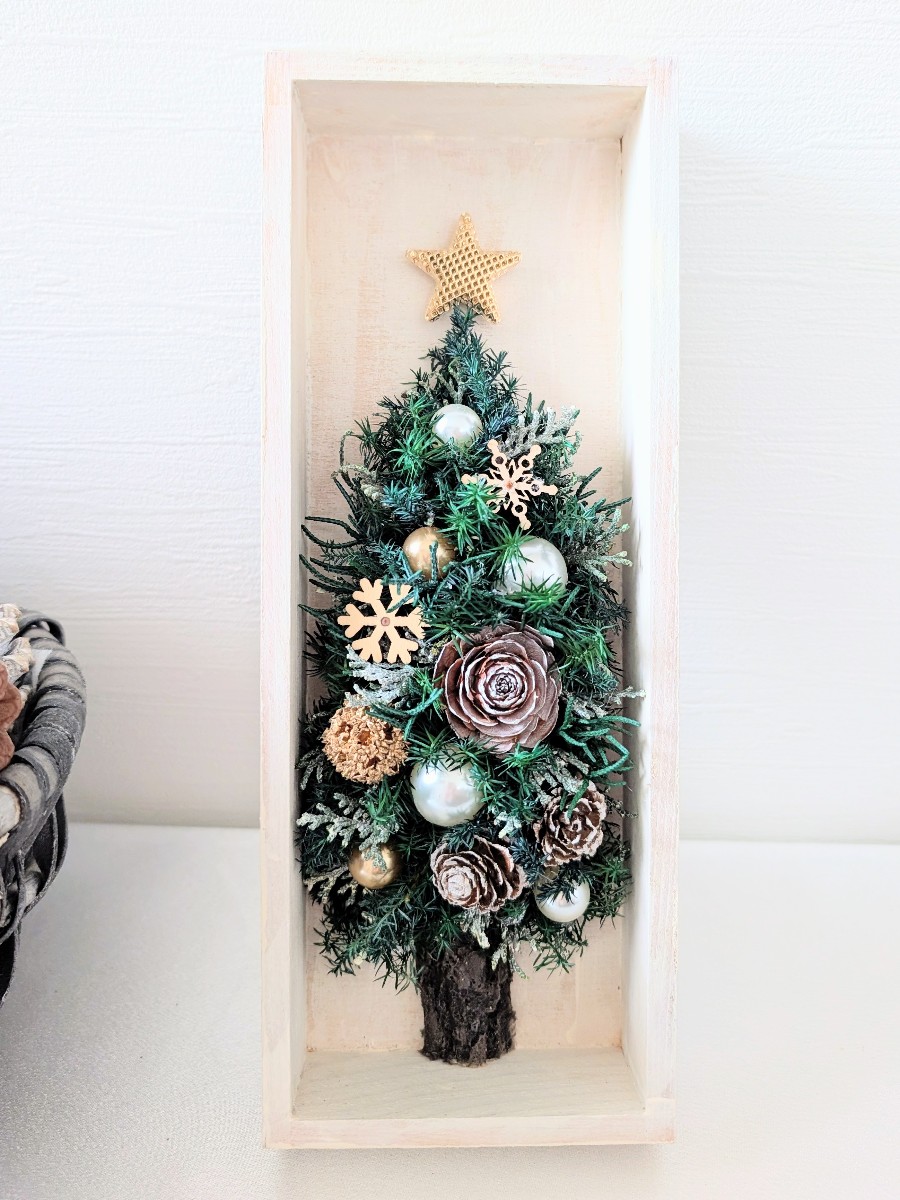 縦型の木箱に収めているので、壁際や細いスペースにも飾りやすく、冬のインテリアにおすすめです。