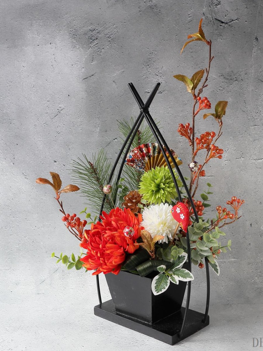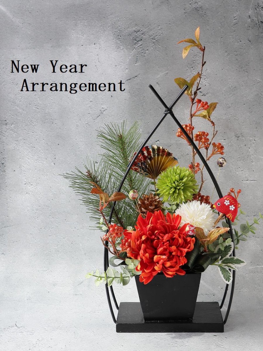 鮮やかなオレンジ色の大輪の菊が華やかなお正月アレンジメントです。