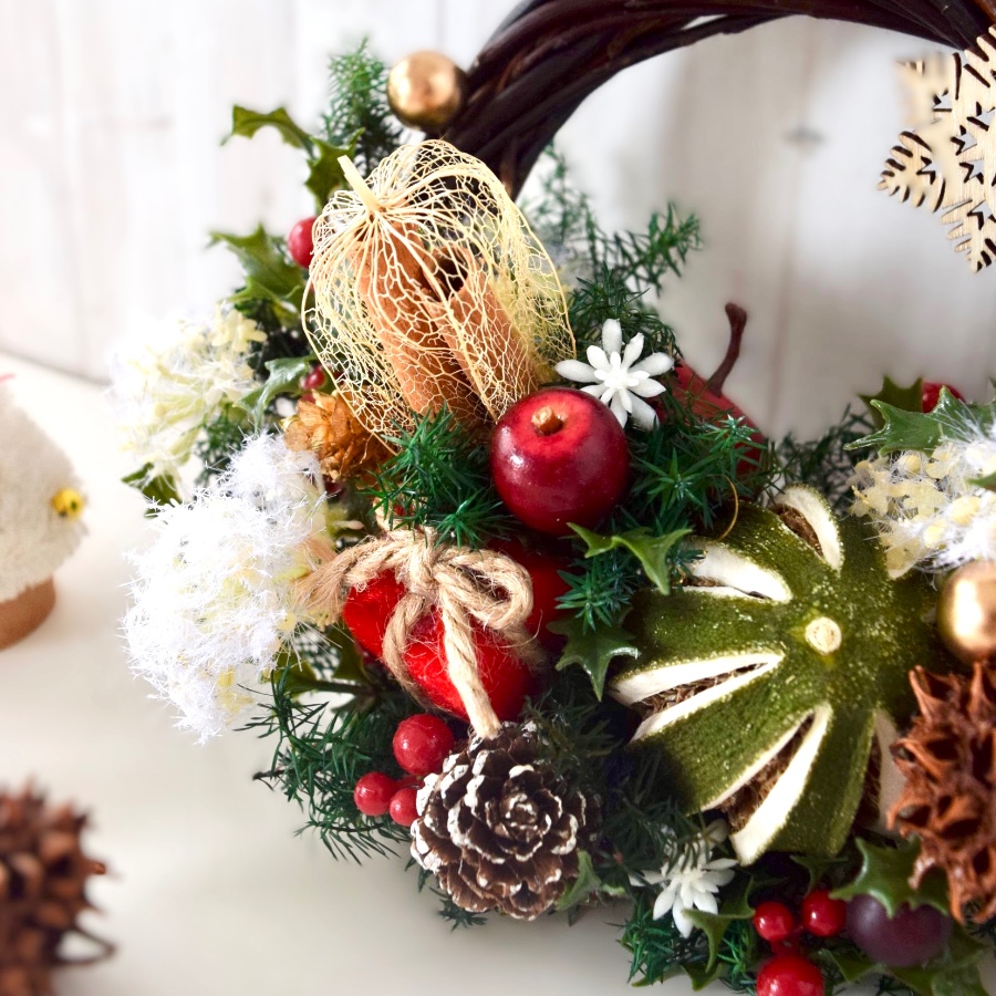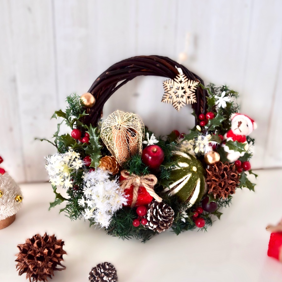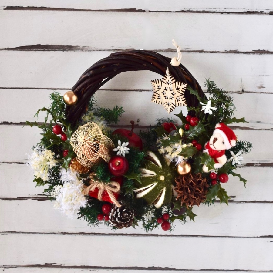 ヒムロスギとヒイラギでベースを作り、ほっこりと楽しい気分になるように仕上げたハーフリース。