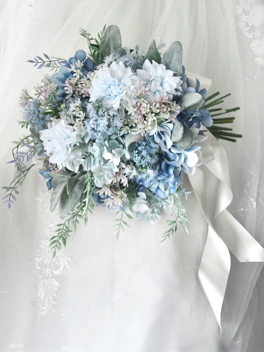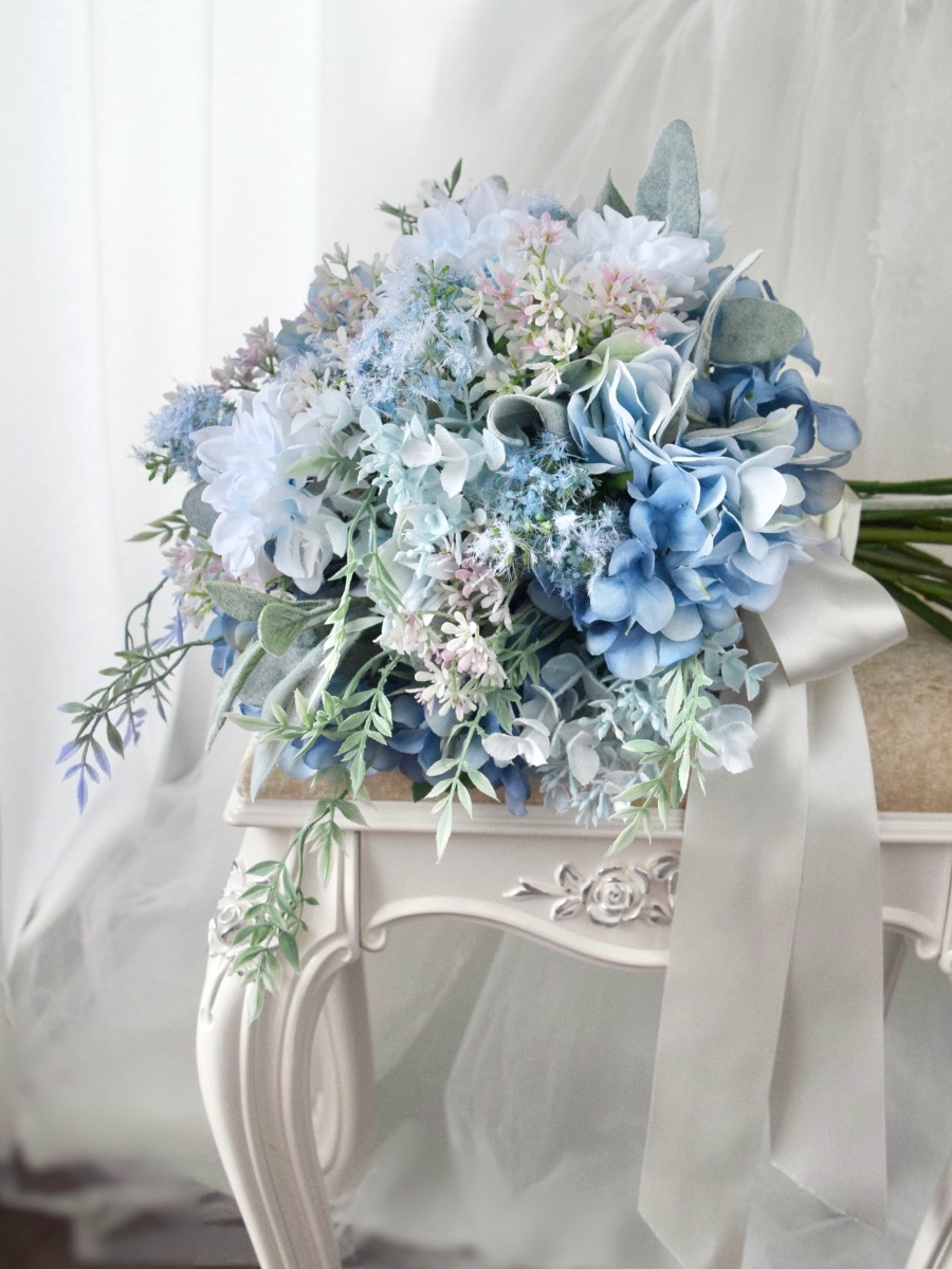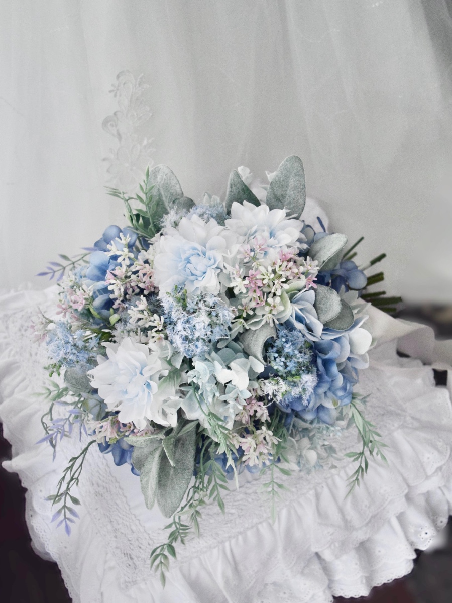 アイスブルーのようなダリアとくすみブルーのアジサイや小花などを組み合わせました。