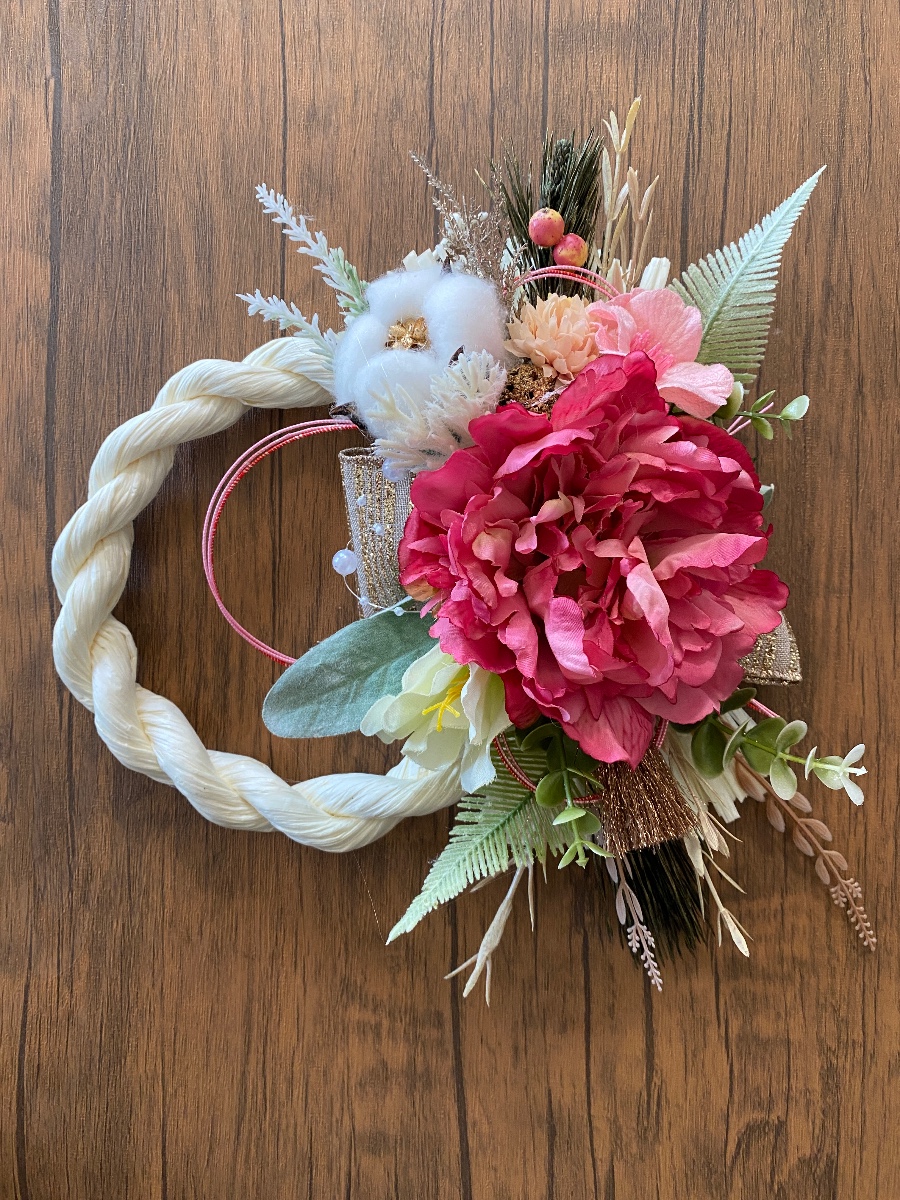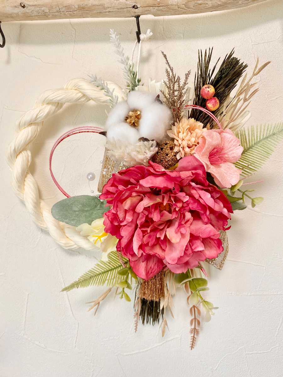 洋風の玄関ドアにも馴染みやすい和×洋の花材で可愛らしく仕上げたしめ飾りです。キナリのベースにパッと明るいピンクのピオニーを主役にゴールドにペイントしたみやこ松やグリーン 、小花を添えました。