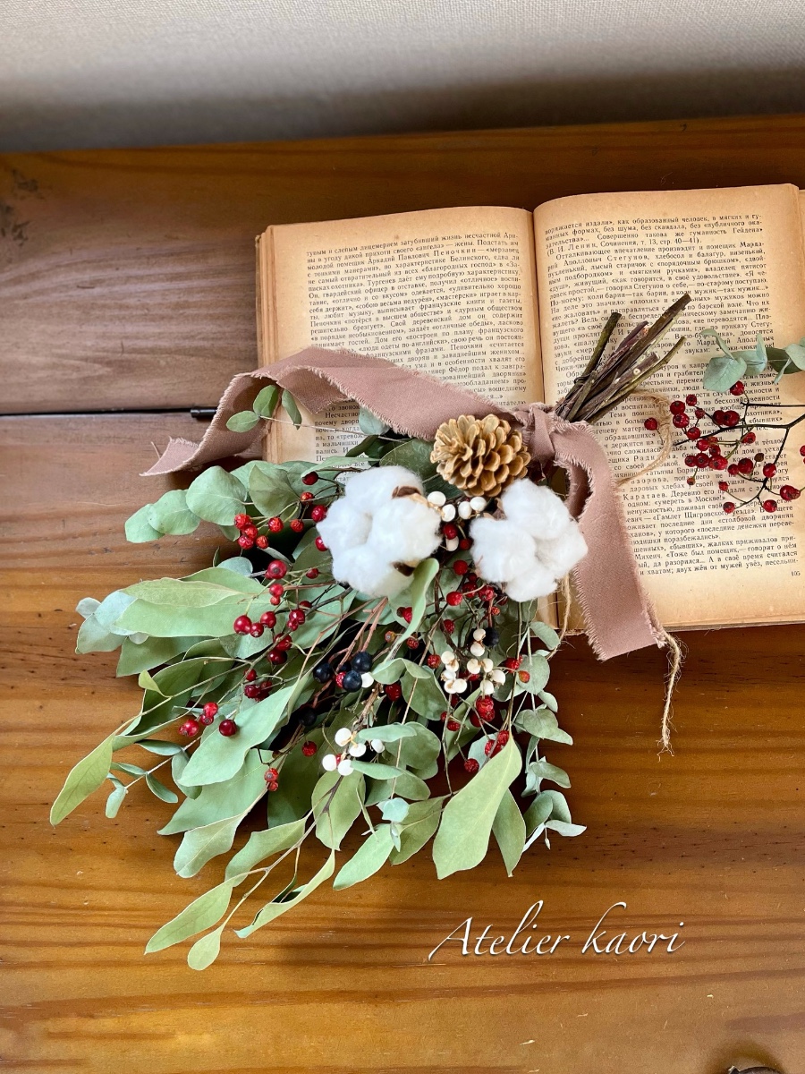 ふわふわとしたコットンフラワーと、アクセントの松ぼっくり、そしてクリスマスムードを高める赤い実や白い実を散りばめ、心安らぐ冬の景色を表現しました。