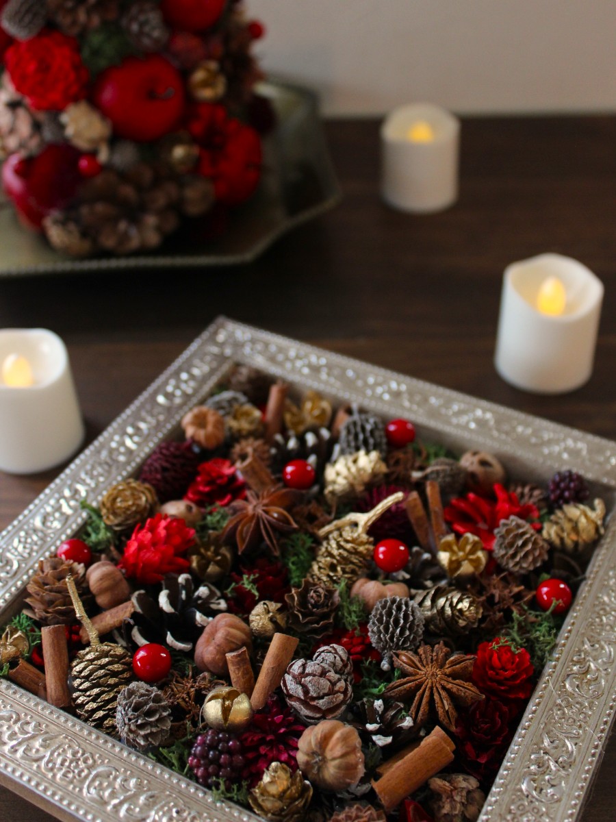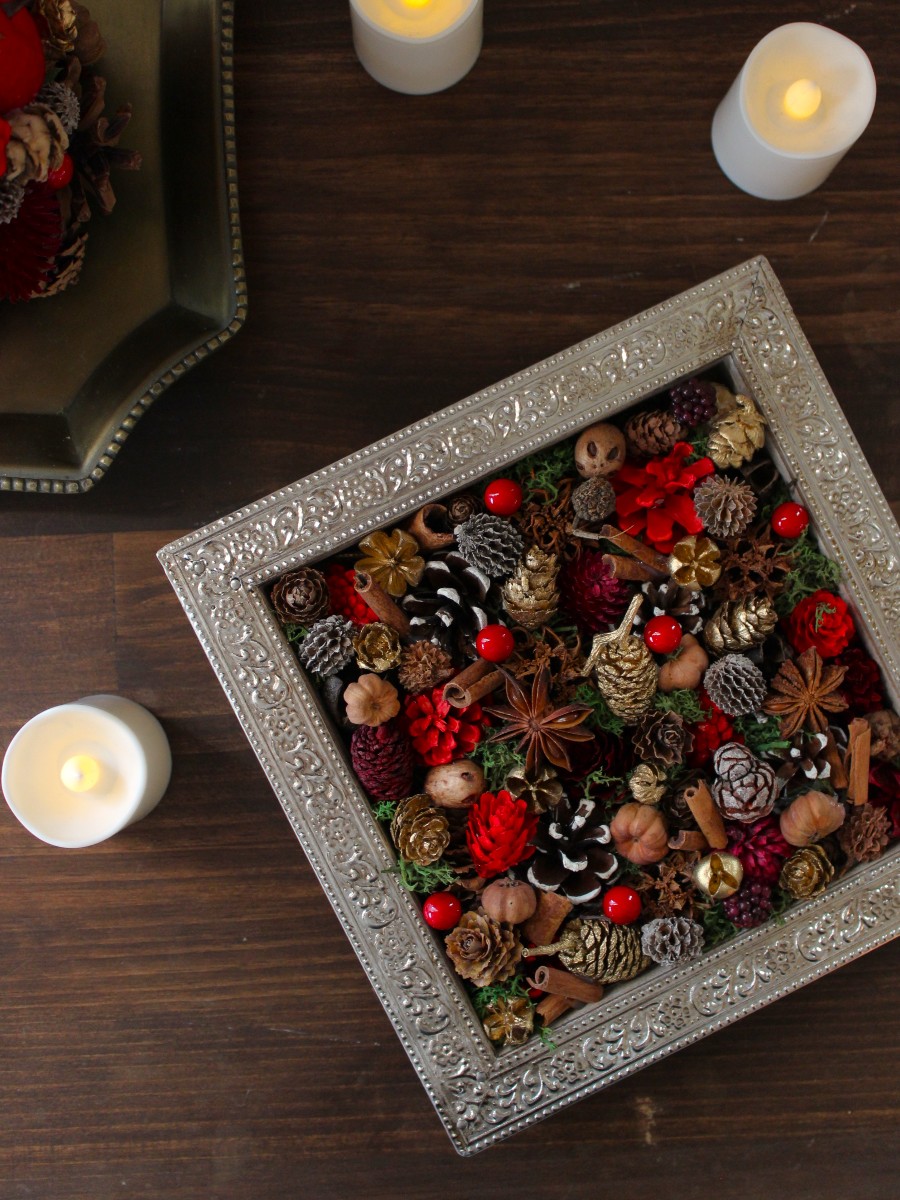 プラチナゴールドのフレームに木の実をいっぱい詰め込んだクリスマスフレームアレンジメント。置いても掛けても可愛い♡ やっぱり緑・赤・茶はクリスマスに飽きのこない定番かつテンションが上がる組み合わせですね!