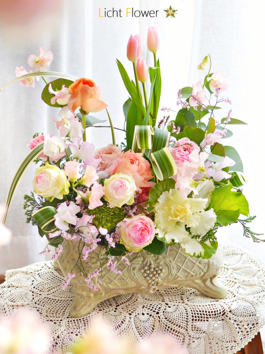 早咲きで出始めたばかりのチューリップと若いニュウサイで動きを出して軽やかにアレンジ。