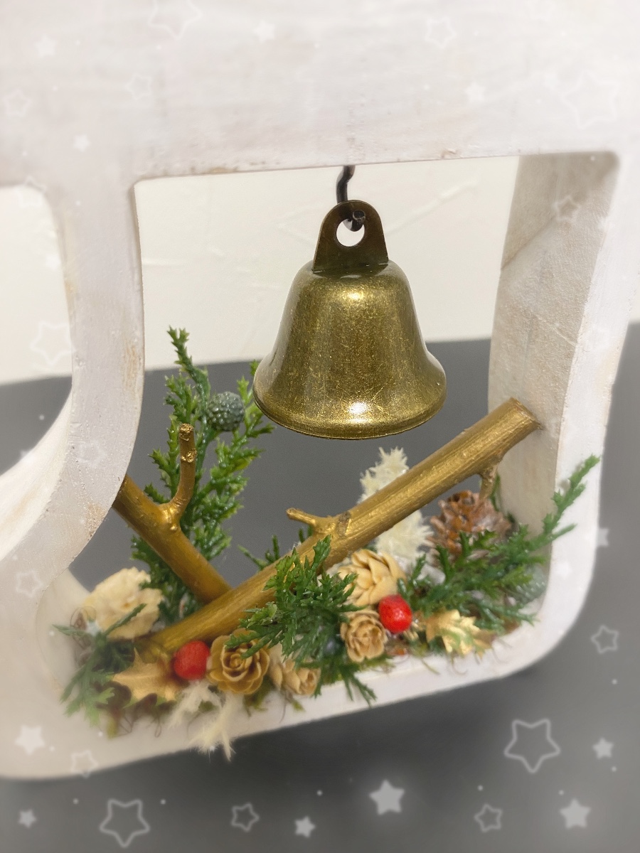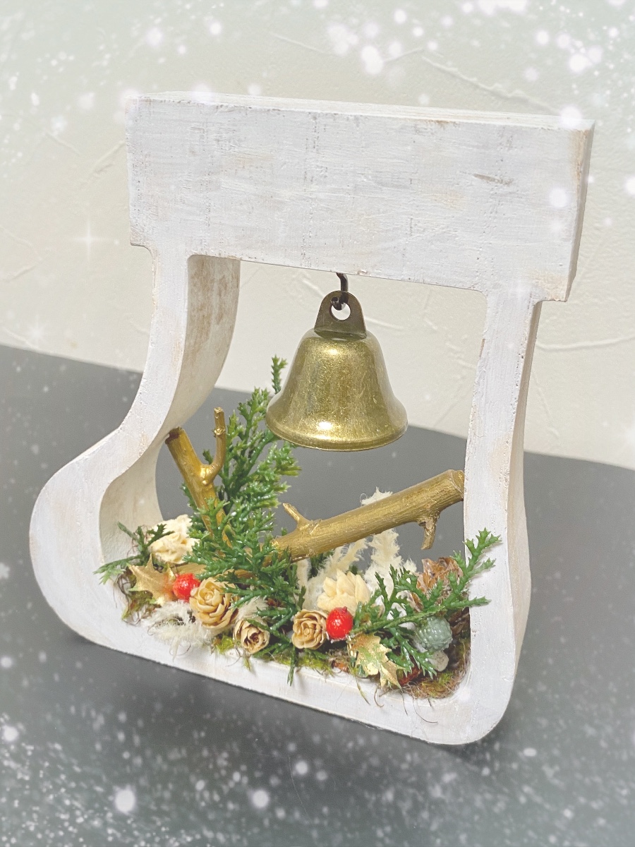 ブーツ型のウッドフレーム にアンティークベルとドライ花材を飾ったナチュラルオブジェです。