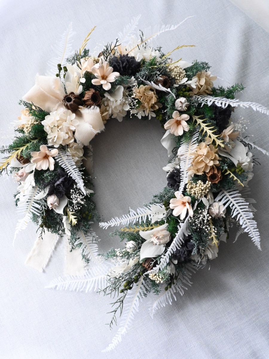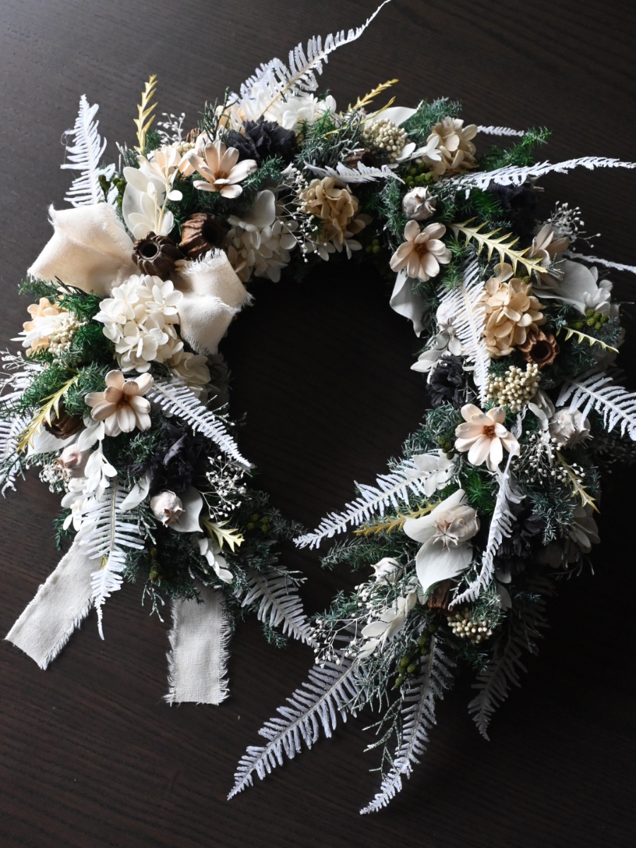 ヒムロスギやブルーアイスをベースに山シダやグレビレアで動きを出しました。柔らかさと瑞々しさを保ちながら、色あせることのない針葉樹。そこにホワイトを多く配置することで、どちらの色も引き立つプリザーブドならではの色合いに仕上げております。