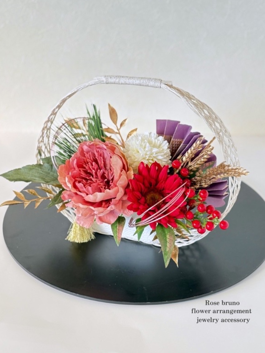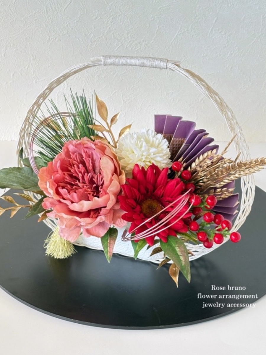 水引を編んだカゴに華やかな花々をアレンジしたお正月飾りになります♪