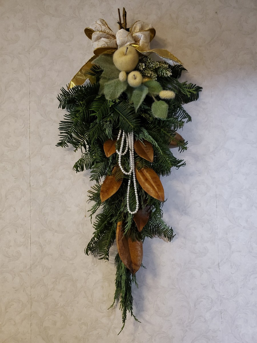 あすなろとコニファーのグリーンにタイサンボクの葉色を生かしてシックに仕上げました。パールのネックレスをあしらいエレガントに!